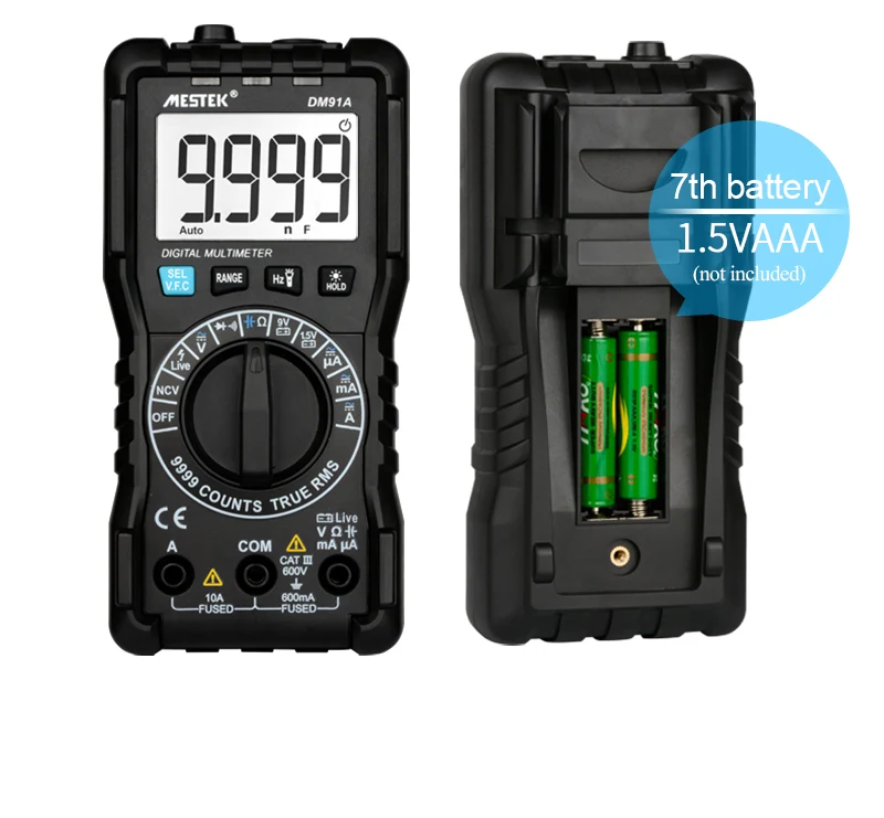 Дисплей: ЖК-дисплей с подсветкой, 9999 отсчетов Диапазон управления: Автоматический диапазон и ручной диапазон Рабочая среда: IEC61010-1,CAT III 600V Диапазон напряжения постоянного тока: 999.9 мВ/9,999 в/99,99 в/600 в Разрешение напряжения постоянного тока: 0.1 мВ/0,001 в/0,01 В/0,1 В Диапазон напряжения переменного тока: 0,999 в/9,999 в/99,99 в/600 в Напряжение переменного тока: 0,001 в/0,01 В/0,1 В Диапазон тока постоянного тока: 999.9uA/9999uA/99.99mA/600.0mA/10A Разрешение тока постоянного тока: 0.1uA/1uA/0.01mA/0.1mA/0.01A Диапазон переменного тока: 999.9uA/9999uA/99.99mA/600.0mA/10A Переменный ток Разрешение: 0.1uA/1uA/0.01mA/0.1mA/0.01A Диапазон сопротивления: 999.9 Ом/9,999 кОм/99,99 кОм/999,9 кОм/9,999 кОм/99,99 мОм/МОм Разрешение сопротивления: 0.1 Ом/0,001 кОм/0,01 кОм/0,1 кОм/0,001 мОм/0,01 МОм Диапазон емкости: 9.999nF/99.99nF/999.9nF/9,999 мкФ/99,99 мкФ/999,9 мкФ/9.999mF/99.99mF Разрешение емкости: 0.001nF/0.01nF/0.1nF/0,001 мкФ/0,01 мкФ/0,1 мкФ/0.001mF/0.01mF Функция: Постоянный/AC Ток напряжения, сопротивление, емкость, измерение напряжения батареи, хранение данных, подсветка, Автоматическое отключение питания, тест NCV, тест на непрерывность зуммера с ЖК-дисплеем, защита от перегрузки, защита от короткого замыкания, идентификация живого огня, тест VFC. Измерение частоты переменного тока, диодный тест Время выборки: около 3 раз/секунду Рабочая температура/Влажность: 0 ~ 40C,<80% Температура хранения/Влажность:-10 ~ 50C,70% Источник питания: 2*1,5 В AAA батареи (не входят в комплект) Процессор хорошего качества Мультиметр устанавливает ядро на интегральных схемах и конвертере A/D и снабжен схемой защиты от перегрузки.