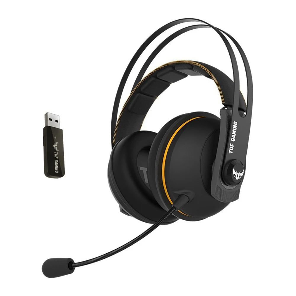 TUF Gaming H7 Wireless: игровая гарнитура для ПК, Mac и PlayStation 4 с беспроводным интерфейсом 2,4 ГГц, длительным временем автономной работы (15 часов и более), 53-миллиметровыми динамиками ASUS Essence, удобными амбушюрами и стальным оголовьем. Подушка для снижения давления для повышения комфорта при ношении очков.