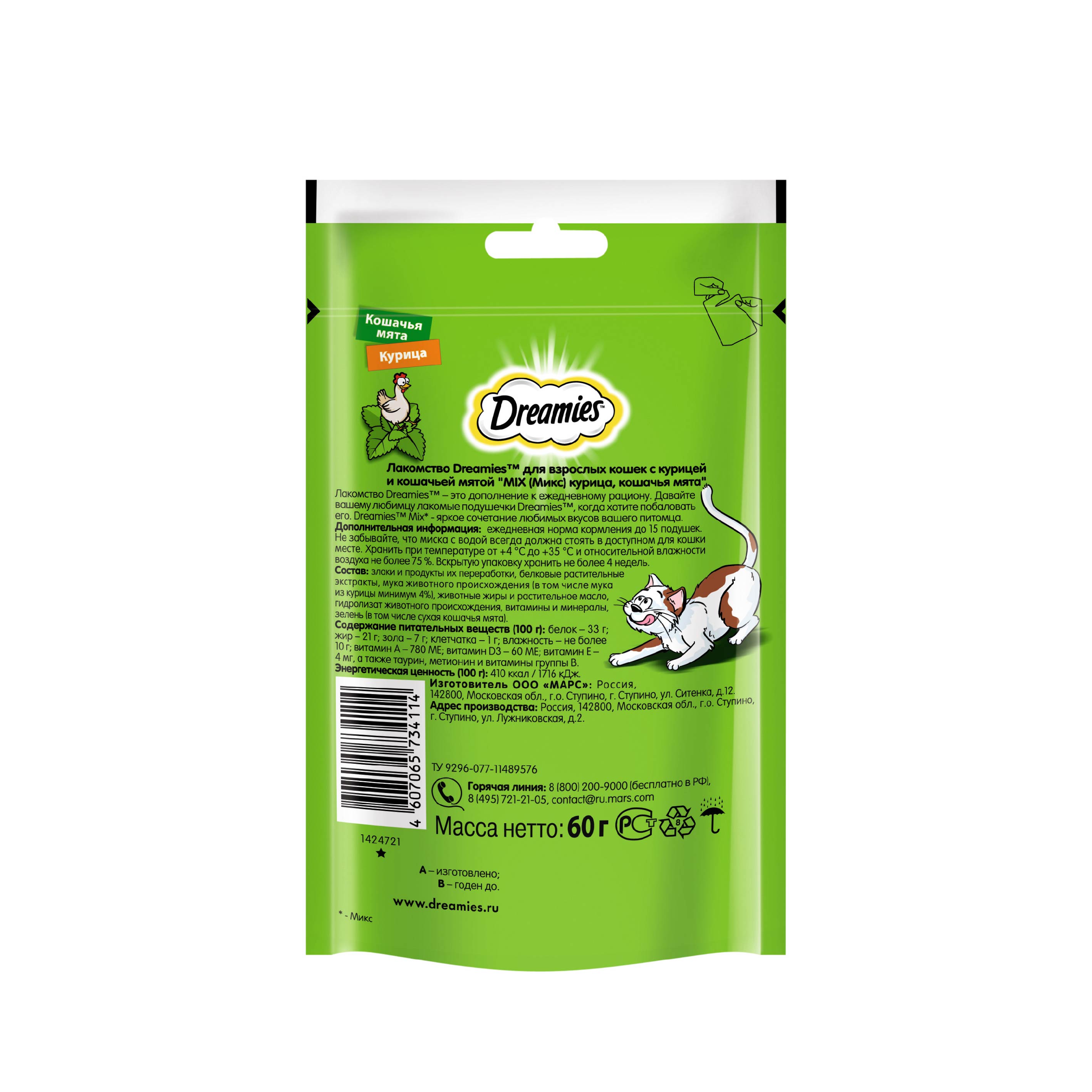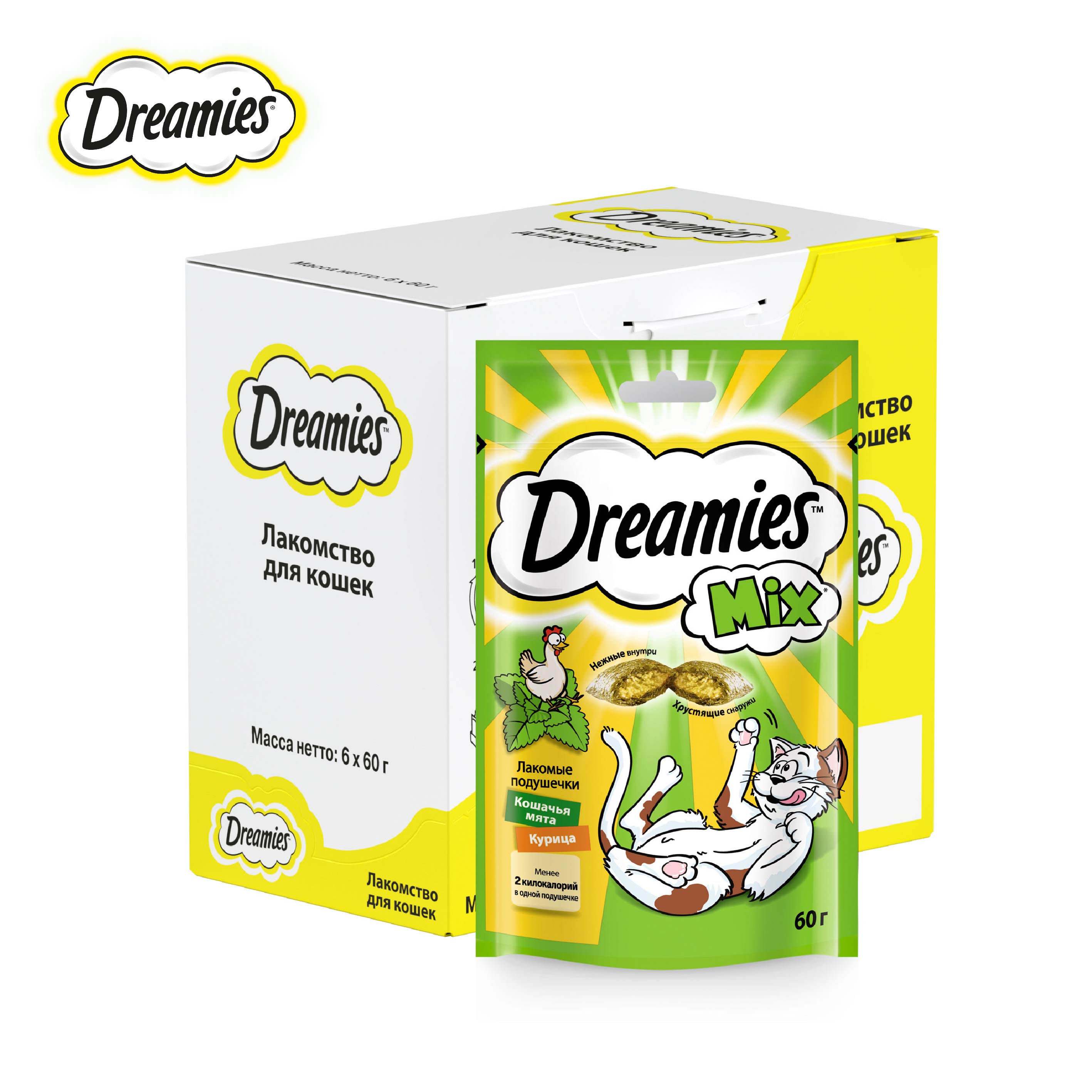 Лакомство для кошек Dreamies подушечки с мятой+курицей, 6 шт по 60г