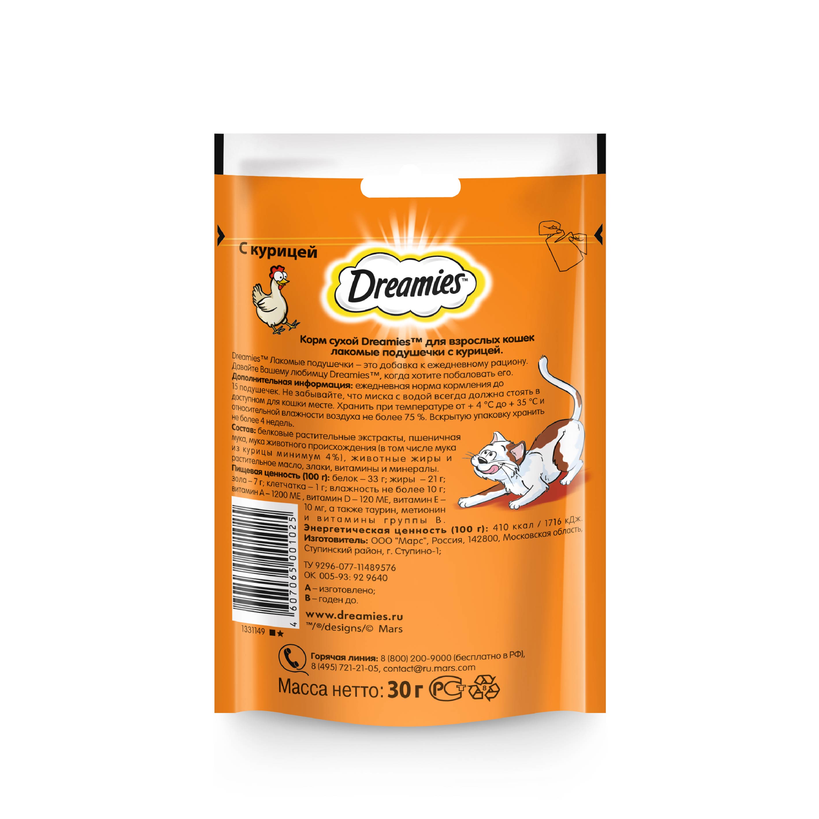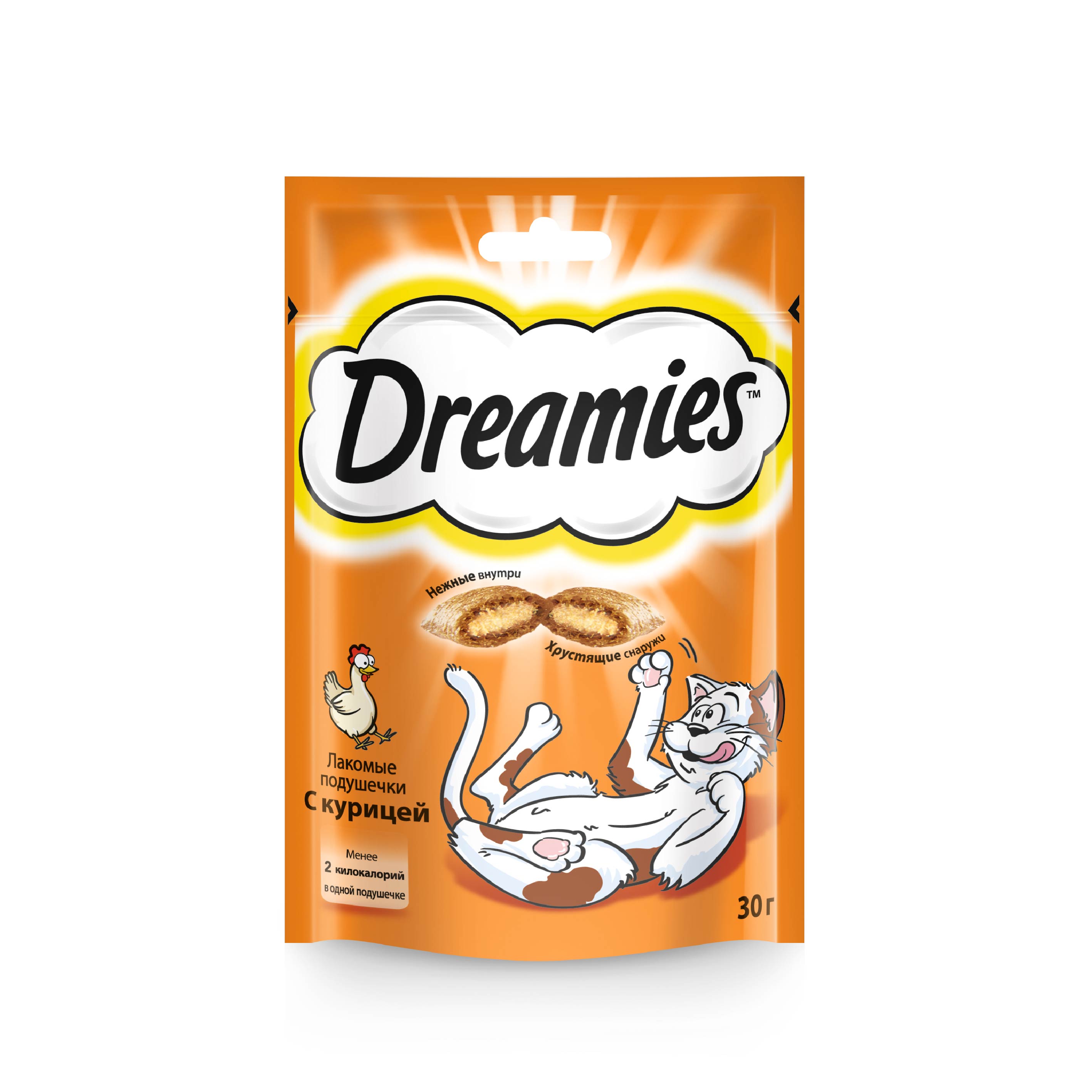 Теперь ему не нужно охотиться, стоит только открыть упаковку, и курочка никуда не убежит! В состав Dreamies Лакомые Подушечки входят важные для кошки питательные вещества, витамины и минералы, а значит, такое угощение приносит не только радость, но и пользу. Кошкам нравится разнообразие в питании и сочетание текстур. Именно поэтому ассортимент вкусов, хрустящая текстура снаружи и нежный паштет внутри делают это лакомство необыкновенно вкусным.