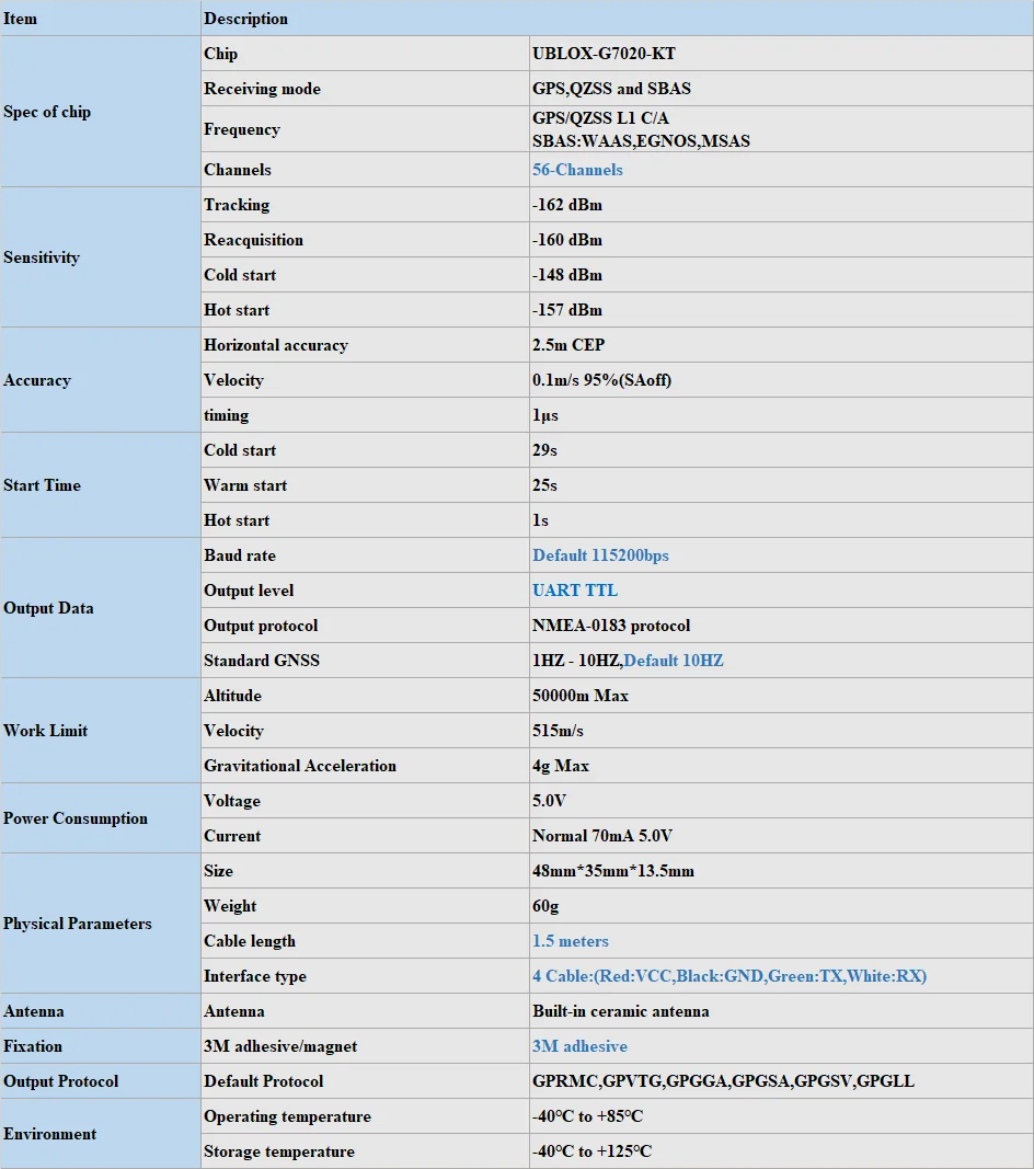 UBX-G7020 чип,4 кабеля: (Красный: VCC,Черный: GND,Зеленый: TX,Белый: RX) ,UART, TTL Тип связи, 1,5 м длина кабеля, 5V рабочее напряжение, 10 Гц, 115200bps,NMEA-0183 протокол.