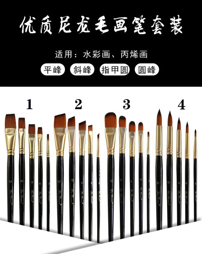 Применение: акварельная живопись, акриловая живопись, масляная живопись Четыре стиля: 1. Плоская вершина 2. Косая вершина 3. Круглая ноготь 4. Круглая вершина