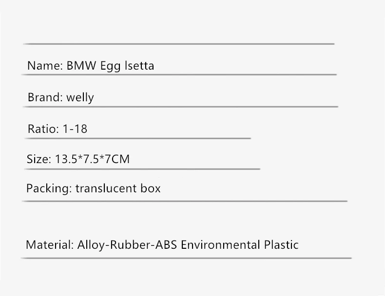 Добро пожаловать в наш магазинНовинка В наличии!BMW Isetta Около 450 граммов Бренд: WELLY Материал: высококачественный металлический сплав и пластик Масштаб: 1/18 Размеры: 13,4*7,8*7,6 см в пределах 1 см. Гарантия качестваВ1: какой материал модели?A1: Да, корпус изготовлен из сплава. Шина резины. Остальные-экологически чистые пластмассы из АБС-пластика. В2: есть ли настоящая Лицензия?A2: продукты, продаваемые в этом магазине, являются подлинный авторизованный моделями Автомобилей, все они являются статическими моделями Автомобилей и строго масштабируются в соответствии с пропорцией тела.ZhВ3: Могу ли я одновременно заказать продукцию различных моделей?Ответ 3: Да. И наш магазин может обеспечить прямую оптовую и оптовую продажу, есть определенная скидка на количество заказанных вами товаров. Свяжитесь с нами для получения более подробной информации