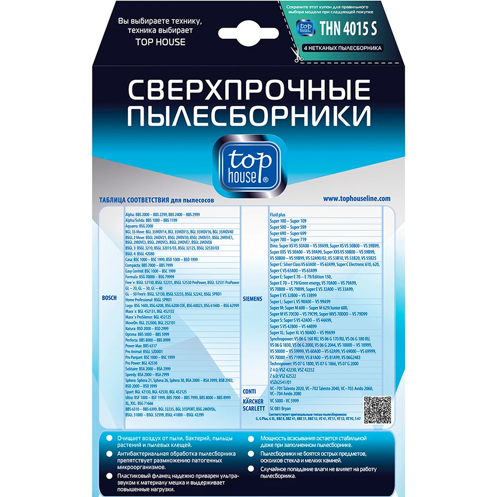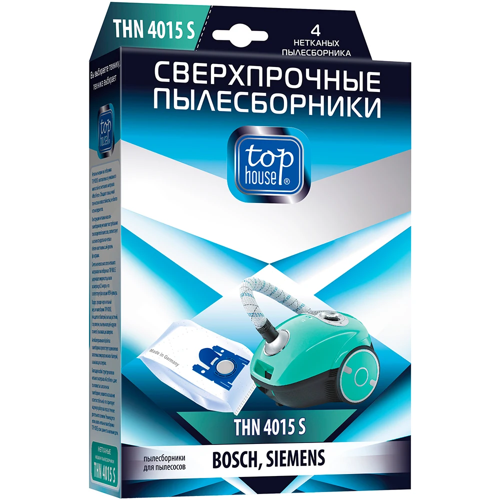 ТOP HOUSE THN 4015 S Сверхпрочные нетканые пылесборники 4 шт. Очищает воздух от пыли, бактерий, пыльцы растений и пылевых клещей. Антибактериальная обработка пылесборника препятствует размножению патогенных микроорганизмов. Пластиковый фланец надежно приварен ультразвуком к материалу мешка и выдерживает повышенные нагрузки. Мощность всасывания остается стабильной даже при полностью заполненном пылесборнике. Максимально полная заполняемость пылесборника позволяет реже производить замену. Пылесборники не боятся острых предметов, осколков стекла и мелких камней. Случайное попадание влаги не влияет на работу пылесборника.