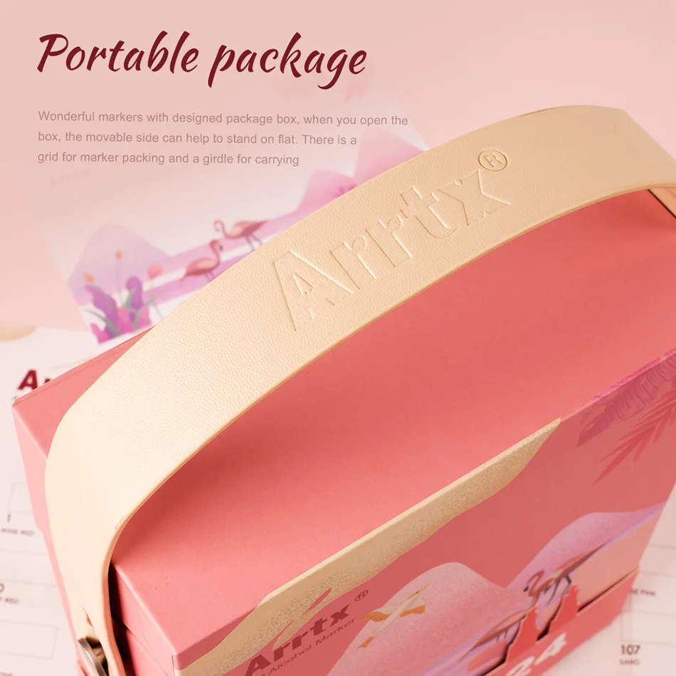 Портативная посылка: замечательные маркеры с дизайнерской коробкой-посылка, когда вы открываете коробку, подвижная сторона может помочь стоять на плоской подошве. Есть сетка для упаковки маркеров и пояс для переноски, пустая коробка также используется для хранения.