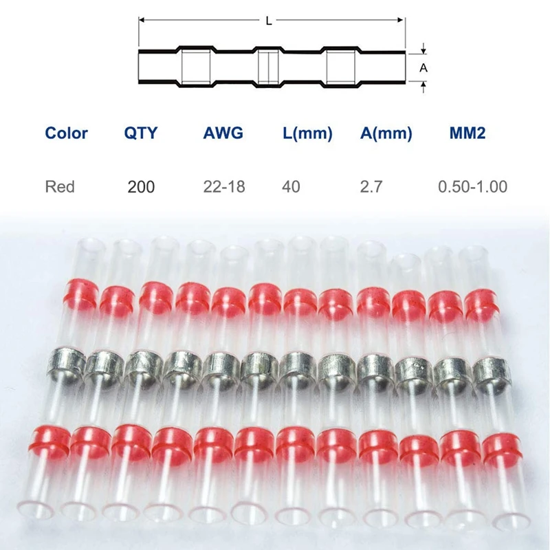 [Complete 200 Piece Set](200 x red shrink connector AWG: 22-18, ) Fix frayed wires in no time! One kit is all you need for small electrical jobs and big repairs alike. Include 200 solder seal wire connectors a that's enough to last for years!
