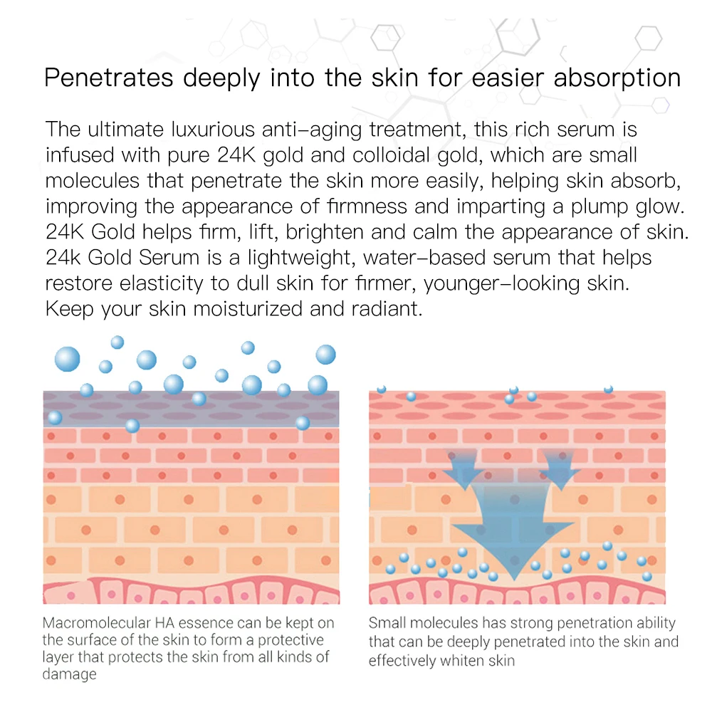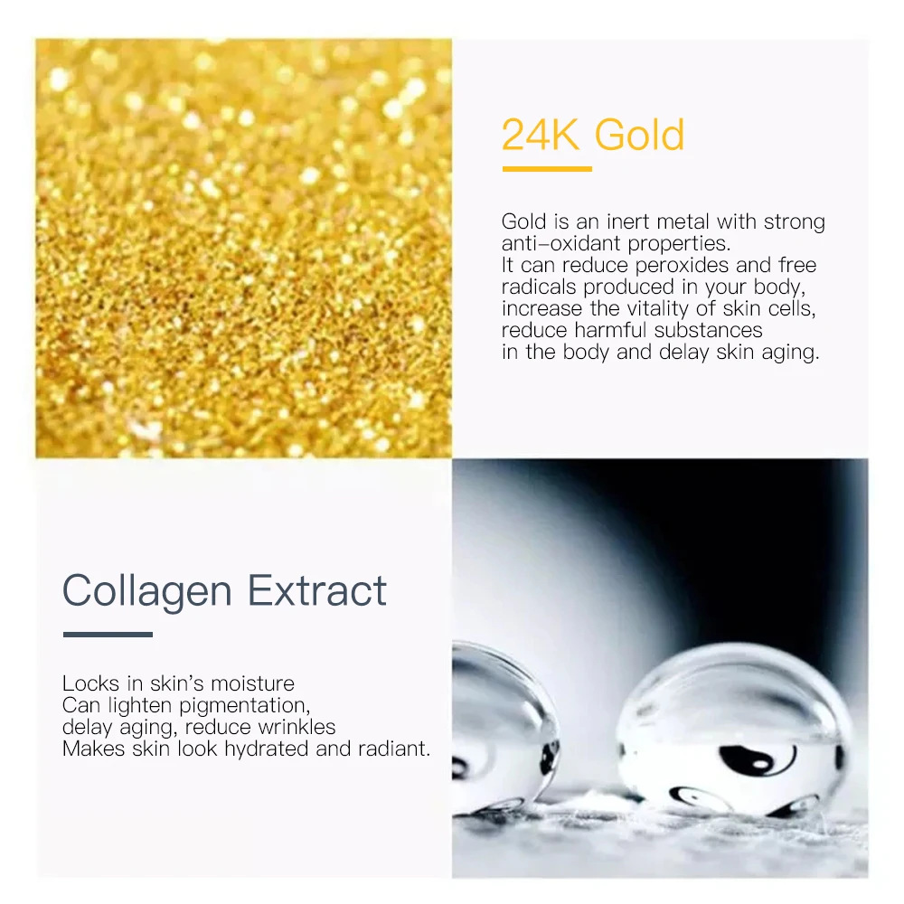 Когда 24K Золотая фольга проникает в кожу, коллаген и эластин под кожей увеличат свою активность под ее стимуляцией. Кроме того, с экстрактом коллагена в сыворотке, он может усилить эффект уменьшения морщин и меланина.
