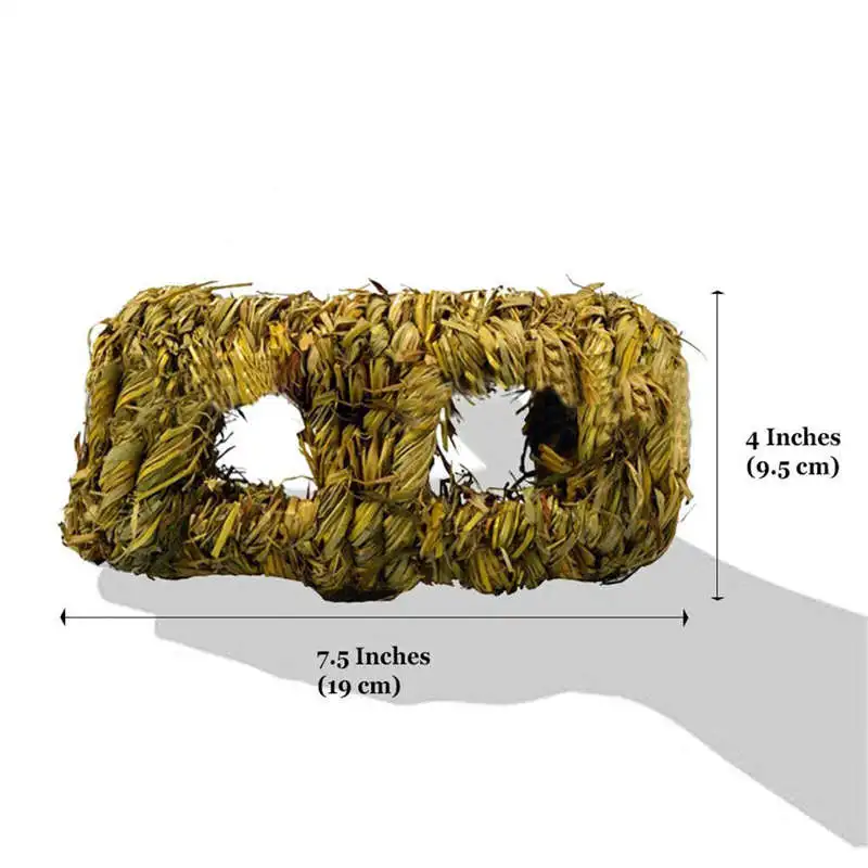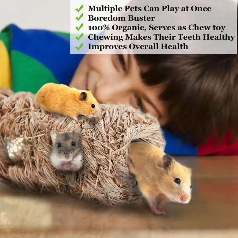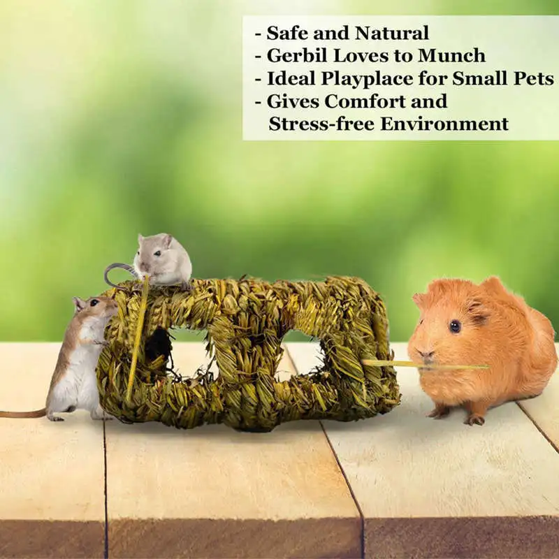 Ручная работа, все натуральные материалы --- безопасная и надежная травяная туннельная Игрушка изготовлена из 100% натуральных материалов без пластика, металла или клея. Это не только Забавный маленький домик для животных, который легко чистить, но и идеально безопасен для ваших питомцев, чтобы они спали и жевали. Ручная трава часто используется для домашнего декора, например, ковриков и ковриков из-за его сырой органической красоты.