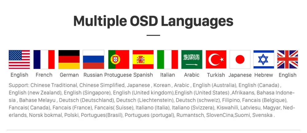 12. Languages with multiple on-screen menus: Chinese (Simplified), Russian, Spanish, Turkish, Russian, Hebrew, Italian, Chinese (Traditional), Arabic, French, German, English, Portuguese, 48 languages. Korean , Thailand, etc.