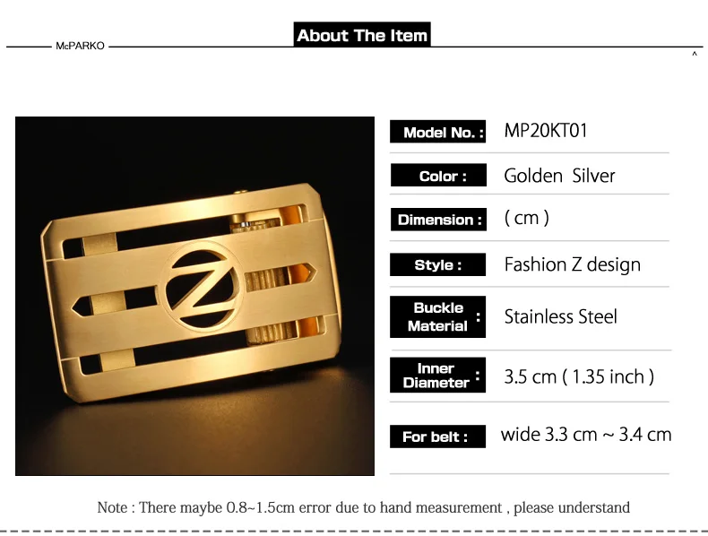 Brand NameMcParkoModel NumberMP20KT01GenderMENItem TypeBelt BucklePattern TypeSolidBuckle WidthmmBuckle LengthmmMeasurement unit100000015Each pack1Buckle MaterialStainless Steel Belt BuckleColorGolden SilverInner Diameter3.5 CMFor the blet Width33~35 CM