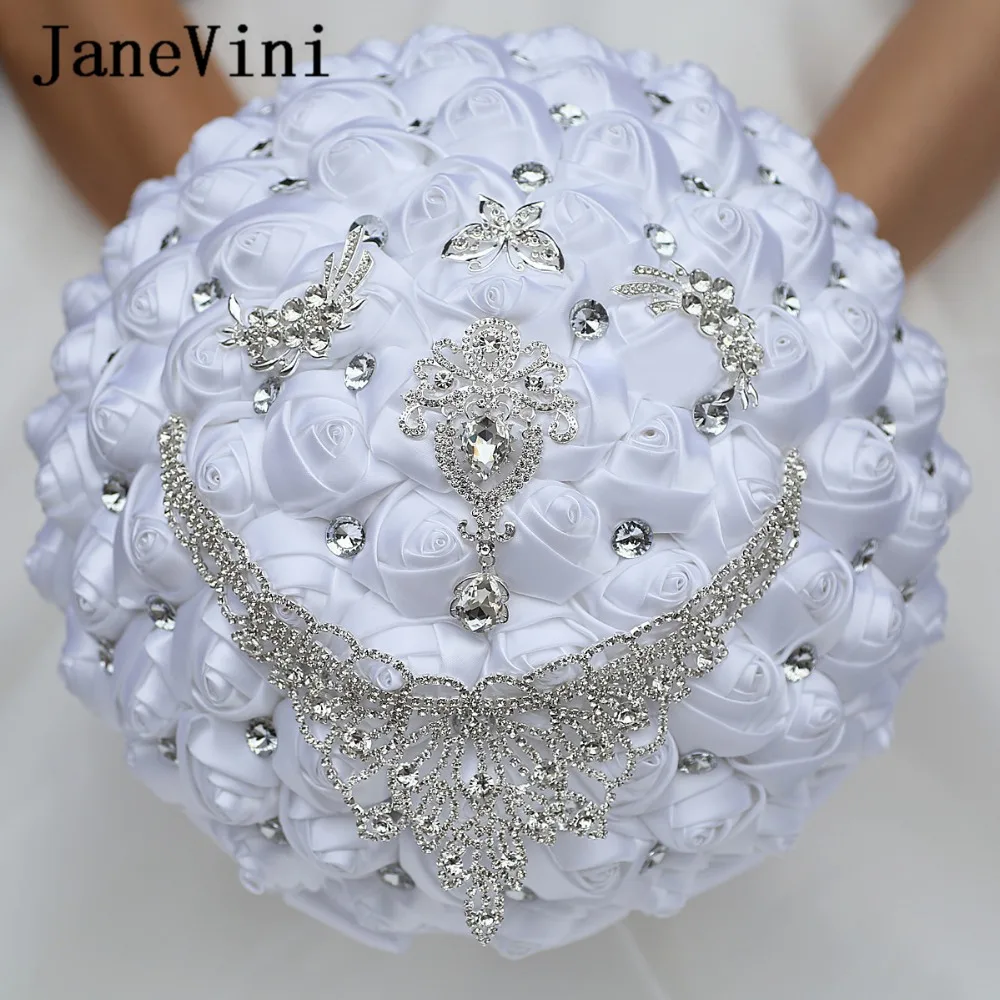 JaneVini 30 см большие белые невесты букеты атласные розы ручной работы Цветы Роскошные хрустальные бабочки ювелирные изделия свадебный букет аксессуары