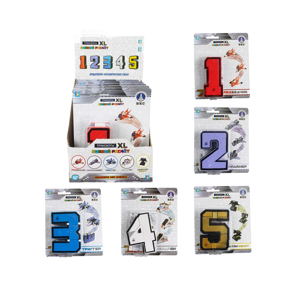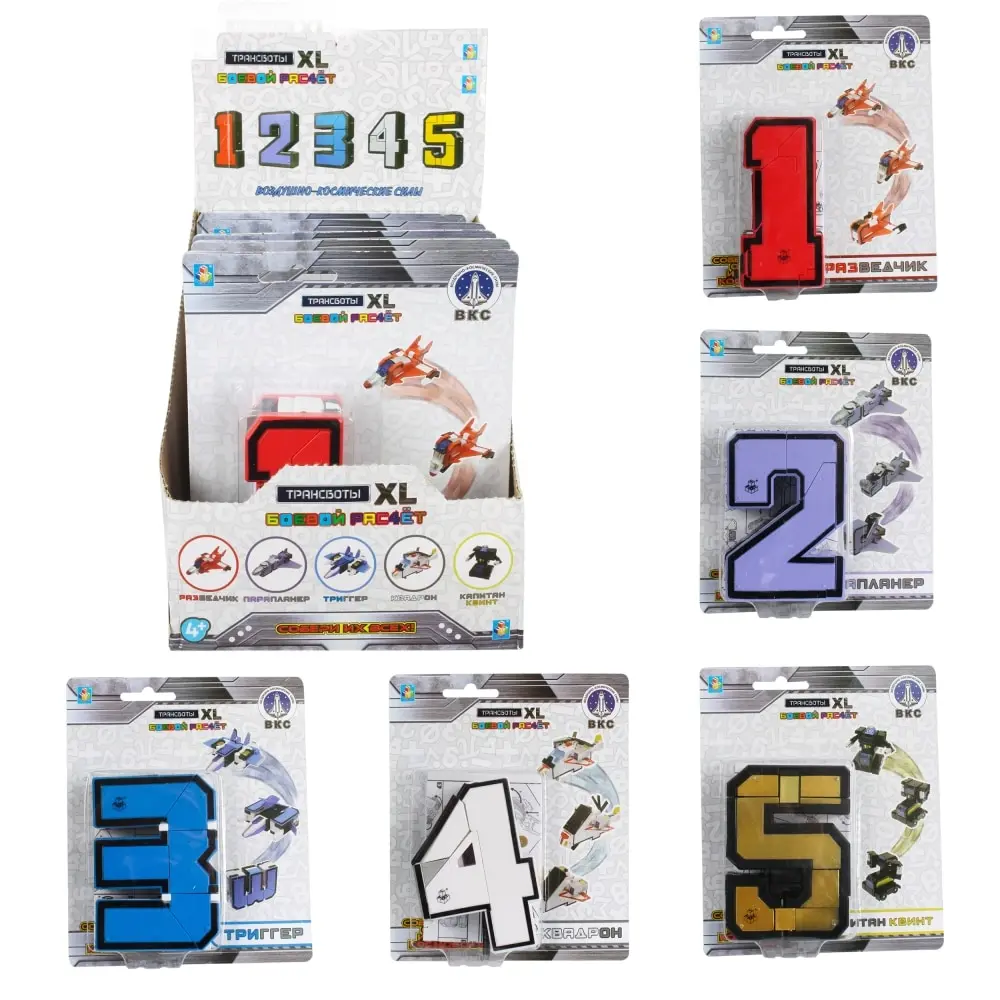 Трансботов много не бывает – встречайте новинку Трансботы XL.Трансботы – это уникальные трансформеры. Цифры превращаются в боевую технику.Трансботы XL больше размером. Каждая цифра-трансформер высотой 10 см.Трансформируй! Готовься к бою! Огонь! Собери весь их всех и построй из 10 цифр двух супер роботов: • из цифр 1-5 собирается Космобот;• из цифр 6-0 получится Фаербот.Трансботы XL «Боевой расчет ВКС» Цифры 1 до 5 трансформируются в технику военно-космических сил.В набор входят:• истребитель «РАЗведчик» – 1;• бомбардировщик «ПАРАпланер» – 2;• штурмовик «ТРИггер» – 3;• вертолет «КВАДРон» – 4;• командир эскадрильи «Капитан КВИНТ» – 5.Помимо того, что каждая цифра трансформируется в единицу техники, из всех пяти цифр можно сконструировать огромного Космобота. Размеры упаковки (1 шт) 18,2*18,3*16,1 см Цена указана за блок - 5 шт.
