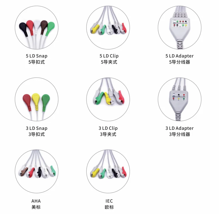 9. Доступны различные разъемы для кабеля ЭКГ, совместимого с большинством мониторов пациентов.