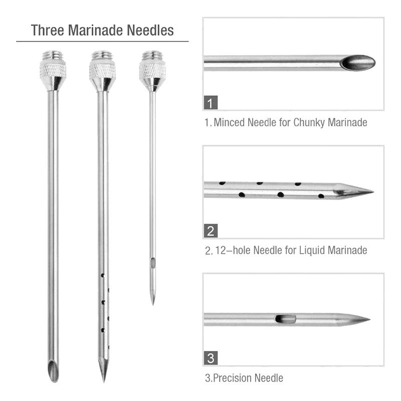 3 иглы для лучшего маринования: наш набор инжекторов marinade включает в себя острые иглы разных размеров и диаметров. Один предназначен для инъекций жидких маринадов, а другой-для маринования трав, приправ, соусов, чеснока, лука и других твердых веществ непосредственно в мясо. Вставка инжектора маринада непосредственно в мясо позволяет специям глубже погружаться в продукт и равномерно рассеиваться.