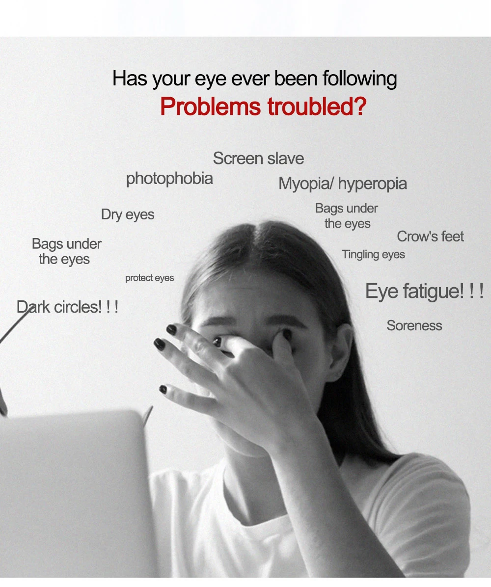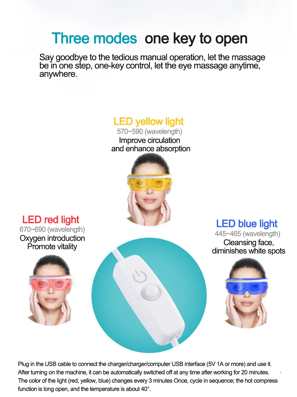 1.Adopt non-toxic and anti-bacteria silicone material, hygiene and safe to avoid causing damage or infection to your eyes, soft and comfortable for all season wearing enjoyment, burden free and breathable.2.Three different LED lights in various wavelengths can give off energy for beneficial effects to provide multipurpose photon therapy to improve the fitness of your eyes areas.3.Hot compress function will deliver constant 40 degrees constant heating to promote blood circulation, effectively helping relaxing the muscle around your eye areas and relieve the eye fatigue by long time playing the cellphone or watching the computer screen.4.High elastic strap can keep the mask in place, adjustable buckle can widely suit different head sizes with custom fit and comfort.5.Powered by plug-in USB charging cable, you can directly power on or off and adjust the light modes according to your demands via wire control and one-key switch.6.Lightweight and portable design, convenient to put in your bag to carry around, suitable for personal home use or travel use.7. Efficacy:eyecare,sleepimprovement,darkcirclesremoval.8.Features:Siliconedoubleairbagairpressurekneading,ABSdropresistantlens,adjustablebuckle,USBpowered,one-keyon/off.9.Threecolors:bluelight:oilcontrolacne;yellowlight:skinrejuvenation&wrinkleremoval;redlight:pigmentfading. LED FunctionRed Light(670-690nm) Help increase blood circulation and stimulate skin cells to excrete collagen and speed up metabolism, making your skin firm and shiny in smooth texture. Blue Light(445-465nm) Inhibit acne growth with anti inflammation and skin repair effect, reduce the risks of leaving scars.Yellow Light(570-590nm) Improve cell oxygen exchange and promote micro circulation to replenish energy for skin cells.