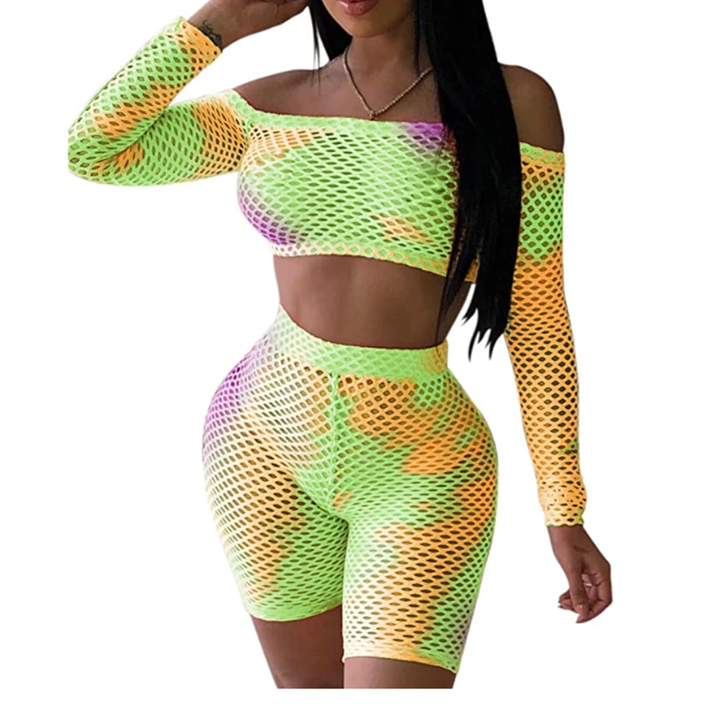 Женский сексуальный сетчатый облегающий костюм, короткий топ с открытыми плечами и длинным рукавом + короткие штаны с высокой талией