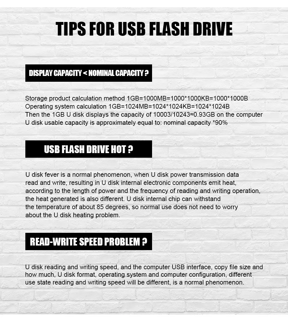 Production instructionsmetal cle usb flash drive 32GB 16GB pendrive 128GB 64GB waterproof pen drive 8GB flash usb 2.0 memoria usb stick key Custom logoSpecifications:● Read Speed: 10MB -18MB/second● Write Speed: 5MB -8MB/second● USB 2.0 interface with higher speed and higher stability● Portable, lightweight, high-quality metal protects the connector● Pre-loaded document viewing software for all major file formatsmetal cle usb flash drive 32GB 16GB pendrive 128GB 64GB waterproof pen drive 8GB flash usb 2.0 memoria usb stick key Custom logo4GB = about 3.6GB-3.8GB8GB = about 7.4GB-7.6GB16GB = about 14GB-15GB32GB = about 28GB-30GB64GB = about 58GB-60GB128GB = about 110GB-120GBфлешка usb флэш-накопители флешка usb флешкарта usb флешки флэшка usb флешка флешка 64 гб флеш накопитель флешка 128 гб флешка 32 гбAbout Capacity : Due to different ways of computing, or the existing bad block, or some built-in software , the memory capacity of the usb flash drive may show less on the PC . And the more capacity is, the more deviation is. Storage Industry Area calculation method: 1GB=1000MB=1000*1000KB=1000*1000*1000B Operation System calculation method: 1GB=1024MB=1024*1024KB=1024*1024*1024B So 1GB storage in OS shows as: (1000^3)/(1024^3)=0.93GBThis is the calculated difference between the manufacturer and your PC, please get Google "USB Flash Drive Capacity" for more information.