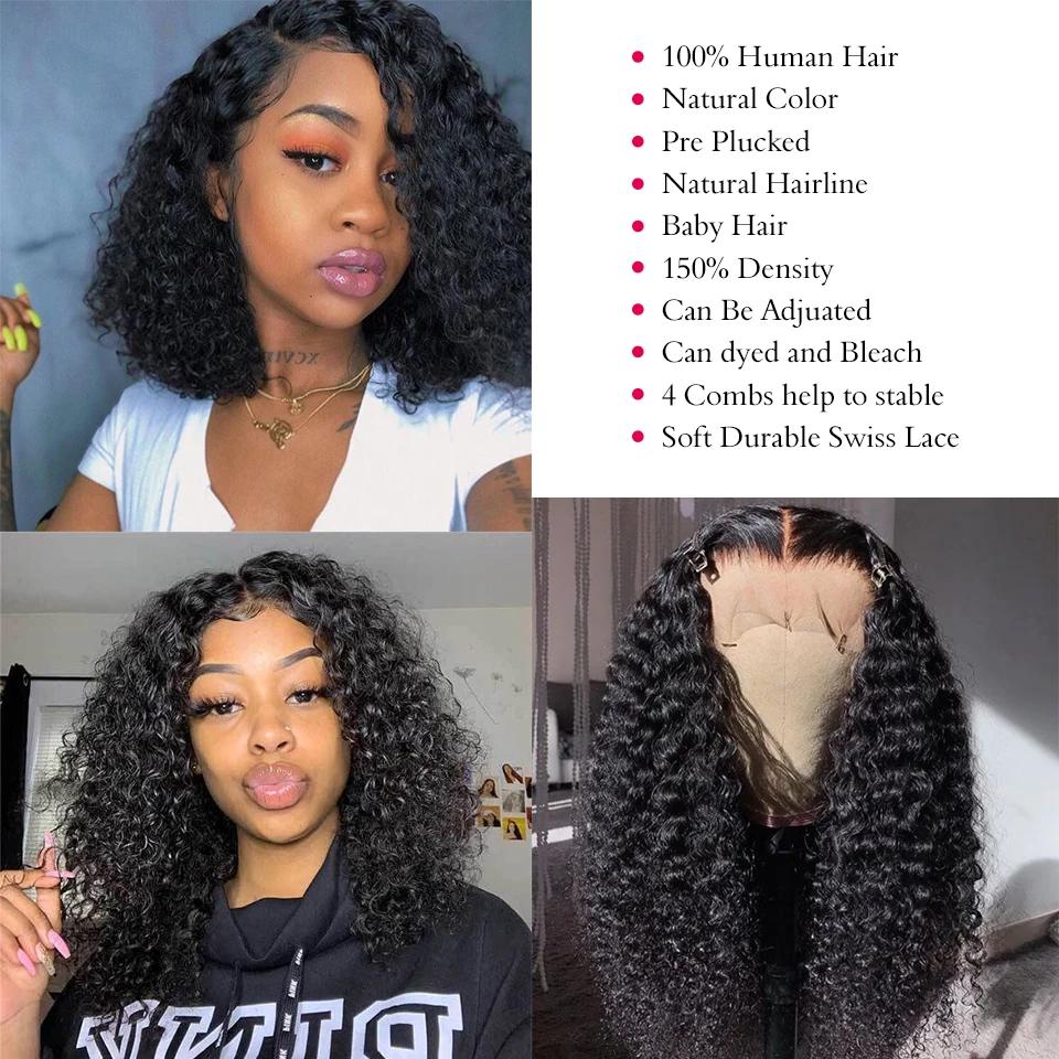Black Pearl Kinky Curly Lace Frontal Wig 4X4 Closure Bob Short Remy Pixie Cut Pre Plucked Brazilian Human Hair