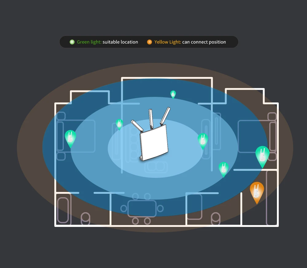 После подключения к существующему WiFi, легко найти лучшее место для расширителя в соответствии с умным WiFi сигналом светодиодный индикатор (turn green)