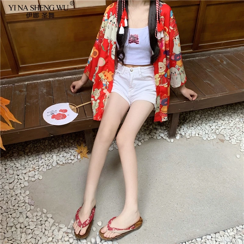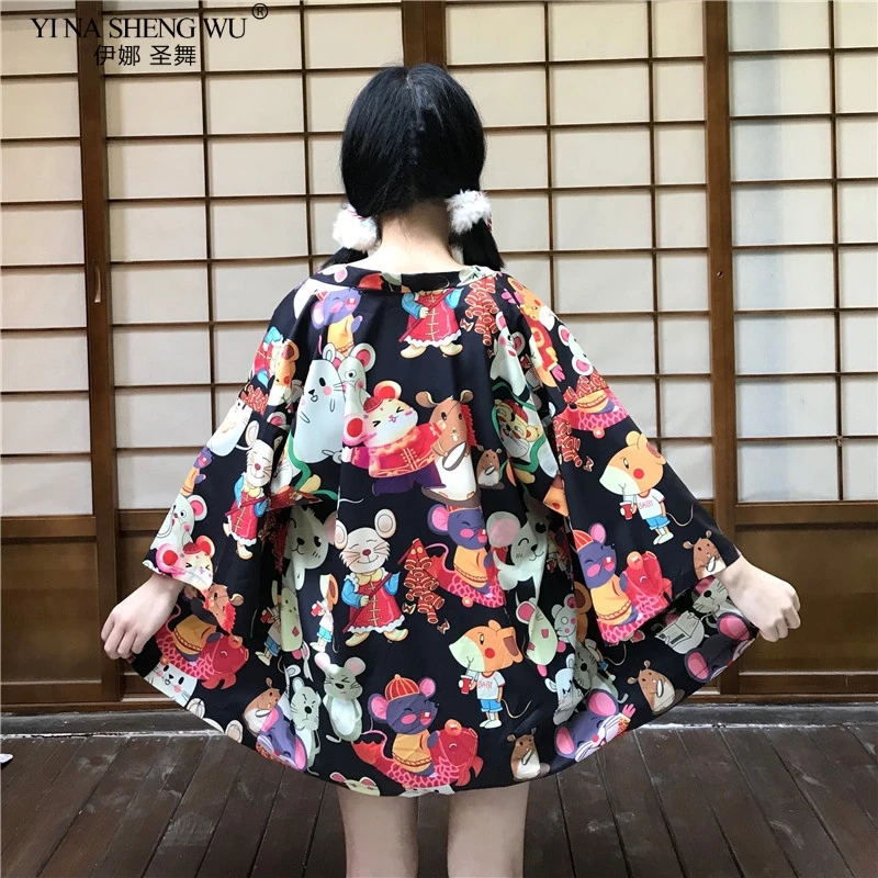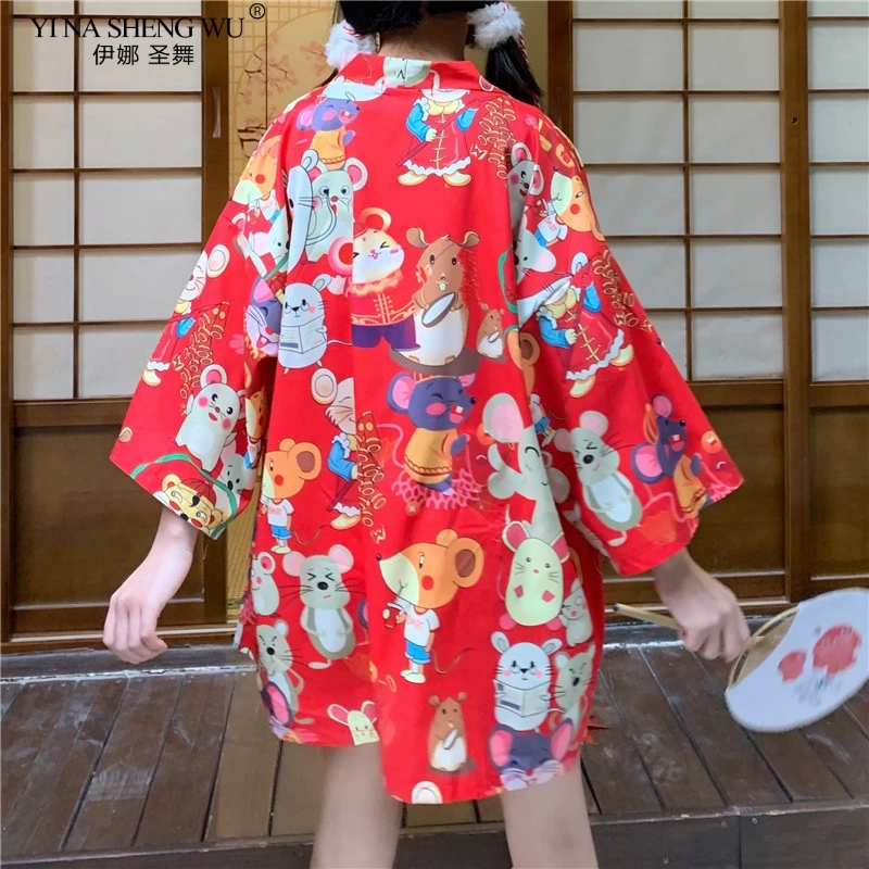 2020 новый год крысы хаори японское кимоно с принтом крысы для женщин Kwaii кардиган Самурай Азиатский костюм пляжные кимоно куртка юката