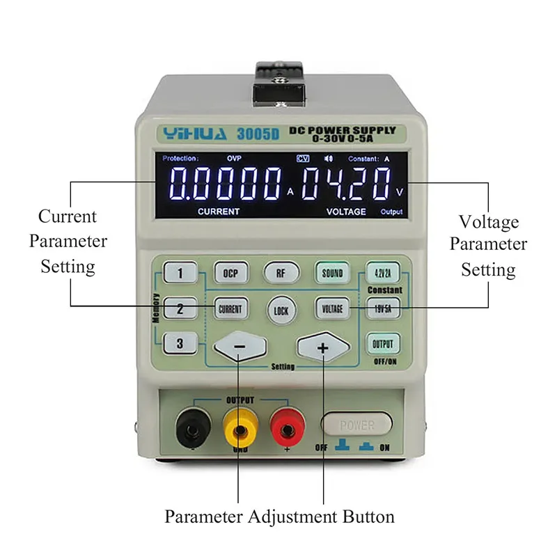 Особенности:1.YIHUA3005D 30V 5A-это второе поколение цифровой программным управлением импульсный источник питания, она использует новейшие технологии и ремесла, вес очень светильник, это 50% светильник er, чем традиционные для постоянного тока питания, это хорошо подходит для транспортировки и экономит стоимость доставки, Это также эффективно предотвращает слишком тяжелые повреждения продукта происходят во время транспортировки.2. Этот Стабилизированный импульсный источник питания с цифровым программным управлением предназначен для использования в лабораториях, школах, производственных линиях и электронном ремонте.3. Он имеет небольшой размер и легкий, который очень прост в транспортировке и переноске.4. Он имеет высокую эффективность, высокую грузоподъемность и низкий уровень шума и превосходит Линейные источники питания.5. Он имеет высокую стабильность напряжения, небольшой пульсационный фактор, отличную защиту от короткого замыкания и защиту от перегрузки по току.6. Он в цифровой форме регулирует ток и напряжение, что является более продвинутым, более стабильным и имеет более длительный срок службы, чем традиционные регуляторы потенциометра.7. Он имеет выходной электронный переключатель, который может легко сломать выходную нагрузку.8. Он имеет блокировку набора функций, которая может эффективно предотвратить изменение параметров выхода или изменение, вызванное неправильным использованием, что делает продукт более безопасным и надежным.9. Он имеет функцию радиочастотного обнаружения сотового телефона, которая имеет фиксированную выходную функцию 4,2 V 2A/19V 5A. Параметры могут отображаться нажатием кнопки, которая является быстрой и удобной. Это незаменимый инструмент для ремонта мобильных телефонов и ноутбуков.10. Он имеет три памяти, которые могут хранить три набора часто используемых параметров для легкого поиска.11. Он имеет функцию памяти выходного состояния. Когда переключатель памяти включен, он может сохранить выходной статус до выключения выключателя питания. Например, когда мощность находится в выходном состоянии, выключите выключатель питания, и когда выключатель питания включен в следующий раз источник питания будет непосредственно выводить напряжение. Когда переключатель памяти выключен, он не будет удерживать выходное состояние, когда выключатель питания выключен. Каждый раз, когда переключатель питания включен, кнопка вывода должна быть нажата для выходного напряжения.