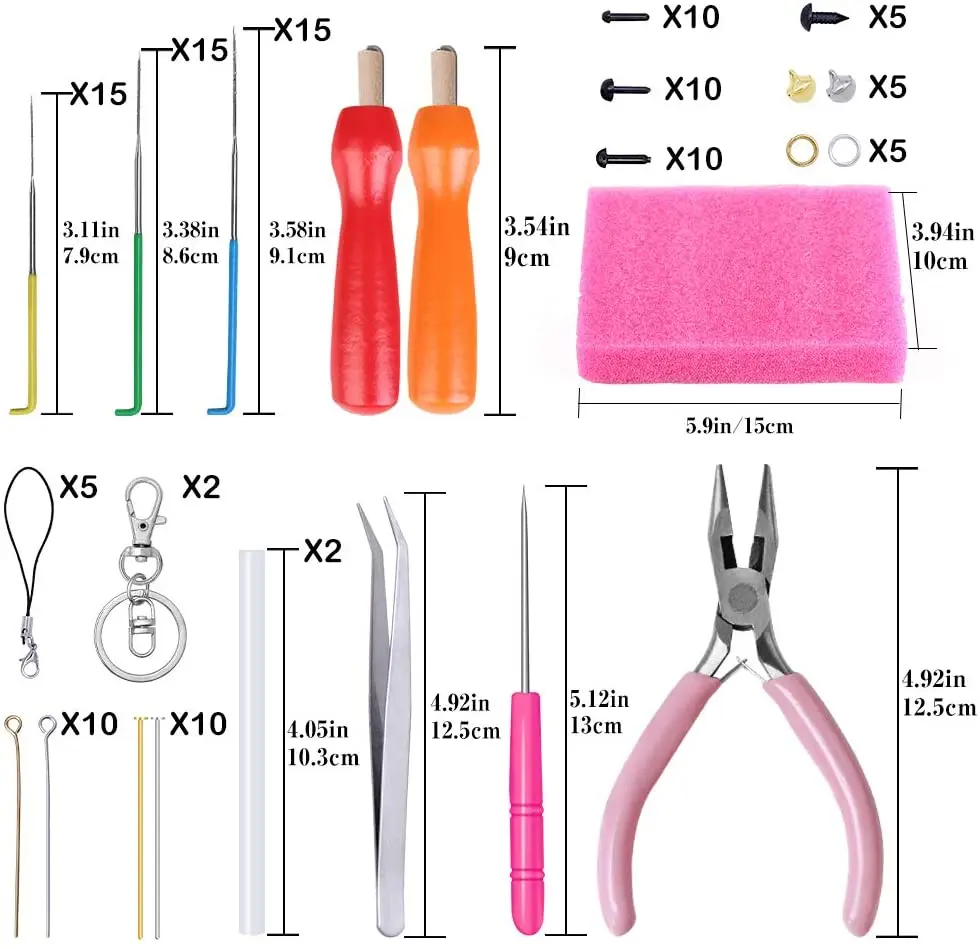 1x Шило 1x плоскогубцы 10 колокольчиков 1x ножницы 1x пинцет 1x Поролоновый коврик 2x брелки 2 клей-карандаша 5х безопасные носики 30x защитные глаза 1x коробка для хранения 7x формочки из шерстяного войлока 45 игл для валяния 50x цвет Шерсть-ровинг 1 пара перчаток 2 держателя с деревянной ручкой 5 шнурок с металлической застежкой Кольца 10 шт. (золото и серебро) 20 штифтов с плоской головкой (золото и серебро) 20x открытый eyepins (золото и серебро)