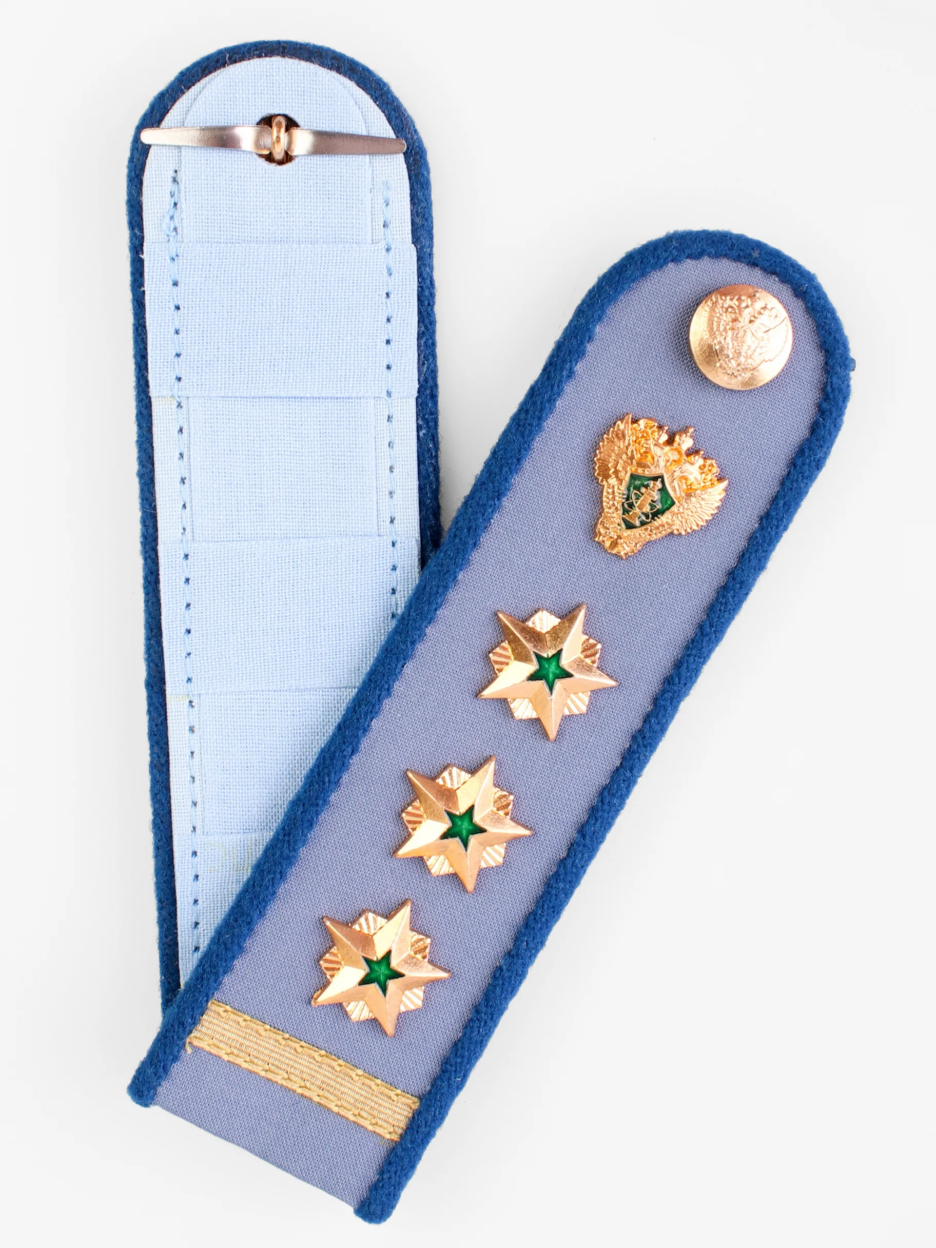 службы Российской Федерации 1класса - одна поперечная полоска золотистого цвета шириной 5 мм и 3 металлические звезды диаметром 20 мм золотистого цвета с сиянием золотистого цвета между лучами. В центре звезды располагается звезда меньшего размера, залитая эмалью зеленого цвета.В верхней части наплечного знака – форменная пуговица диаметром 14 мм. На съемных наплечных знаках на расстоянии 10 мм от пуговицы крепится ведомственная эмблема.Нижняя полоска расположена на расстоянии 10 мм от нижнего края наплечного знака.