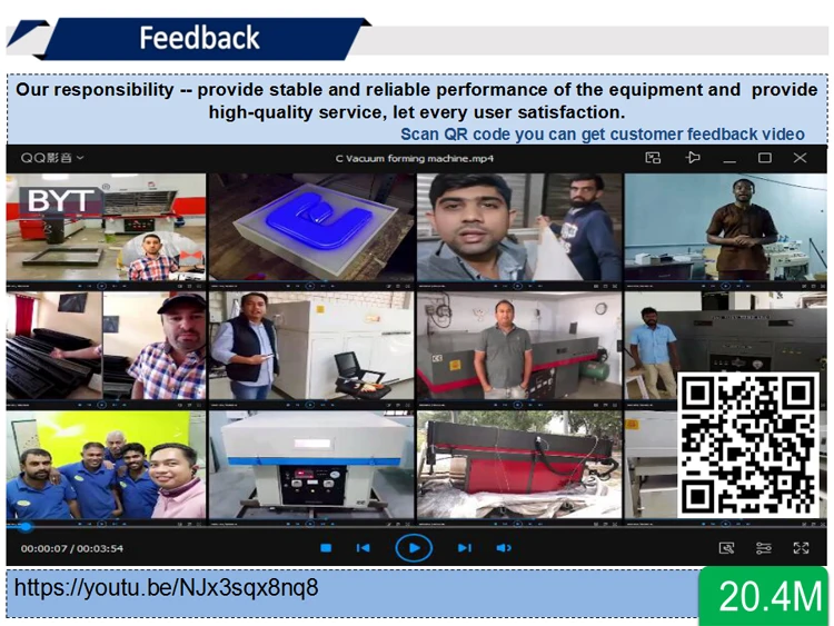 Опыт компании 1. Основана в 1996 году, с зарегистрированными торговыми марками «BAOYUANTONG» и «BYT». 2. Владеет более 30 патентами на изобретение, полезную модель и дизайн. 3. Прошла «сертификацию SGS» 9 лет подряд, и все продукты получили «европейскую сертификацию CE» 4. Экспортируется в более чем 150 стран, включая Северную Америку, Европу, Южную Америку, Ближний Восток, и имеет более 2000 клиентов. 5. Обеспечивает комплексную закупку, позволяет покупателю Совершать покупки более эффективно и безопасно. 6. В соответствии с различными требованиями заказчика, предоставляем оборудование по индивидуальному плану и изготовлению образцов. 1. Что такое вакуумная формовочная машина? В основном используется нагревательная трубка для смягчения пластика, затем используется вакуумный насос для экстракта, после охлаждения Получайте нужную вам форму. 2. Для чего используется вакуумная формовочная машина? Пластиковая форма, изготовление масок, изготовление вывесок посылка, украшение, университетские исследования и т. Д. 3. Какой материал можно использовать? ПММА (акрил), ПВХ, АБС, ПЭ, ПЭТ и т. Д. 4. Как выбрать вакуумную формовочную машину? 1) тип материала и толщина материала менее 6 мм 2) Размер финишной формы изделия 3) Образцы изображений 5. Какой тип машины у вас есть? Сейчас в основном у нас есть три типа вакуумной формовочной машины, основная разница: 1) Серия BX имеет только функцию всасывания, максимальная высота формирования 80 мм 2) Серия BSX имеет функцию всасывания и выдувания, максимальная высота формования может соответствовать 200-300 мм 3 ) Серия BXY имеет функцию нажатия, всасывания и выдувания, максимальная высота формования соответствует 220 мм при использовании функции выдувания Для каждого типа у нас есть подробная информация, здесь есть три типа рабочих видео, вы можете проверить, более подробная информация свяжитесь с нами: