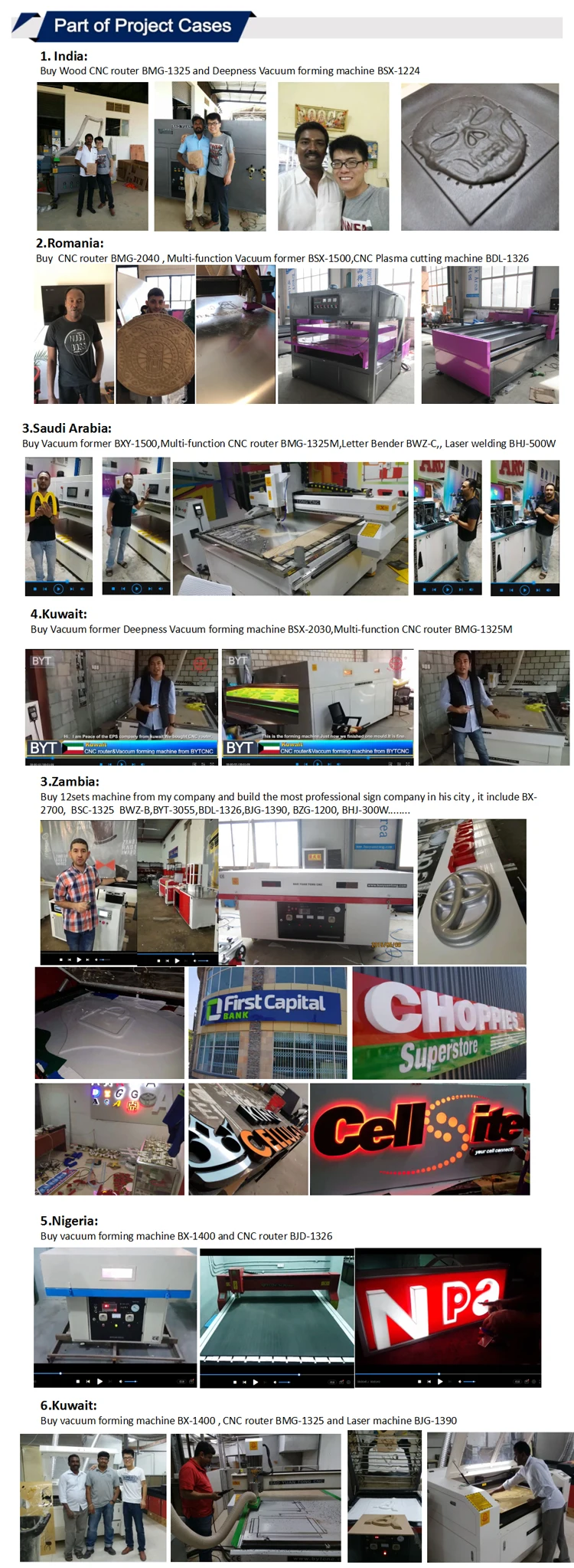 В1 какой материал можно использовать? Как выбрать вакуумную формовочную машину? A1 вакуумная формовочная машина может использовать PMMA (акрил), ПВХ, АБС, ПЭ, ПЭТ термопластичный материал. О том, как выбрать вакуумный станок, обычно нам нужно знать вопросы ниже 1) тип материала и толщина материала менее 6 мм 2) Размер финишной формы изделия 3) Образцы изображений В2 для этой машины какое рабочее напряжение, если вы принимаете индивидуальное напряжение? A2 рабочее напряжение BSX-600 и BX-1400 220 В 50 Гц 1P, нормальное рабочее напряжение другого типа 380 В/50 Гц/3P, мы можем принять индивидуальное напряжение, например, 220 В/60 Гц/3P ,415 В/60 Гц/3P act. В3 когда эта машина работает, если ей нужно оборудование для аксессуаров? A3 если выбрать нагревательный блок, движущийся воздушным цилиндром, когда машина работает, ей нужен компрессор воздуха. Для этого станка работает, если вы используете форму МДФ и хотите сделать самостоятельно, поэтому вам нужно подготовить фрезерный станок с ЧПУ по дереву; Для завершения формовки требуется обрезать нежелательные кромки, нужен триммер. Для этих машин мы все можем предоставить В4 для рабочей зоны или высоты формовки, если вы принимаете индивидуальные заказы? А4 да, мы можем принять индивидуальную рабочую зону и высоту формовки, теперь мы завершаем BSX-2030 Макс. Высота формовки 450 мм. В5 после того, как я куплю эту машину, как вы организуете обучение? 1) при доставке аппарата с руководством по эксплуатации и видео, тем временем все файлы будут сохранены на U-диске, отправьте вам вместе. 2) после доставки станка, наш инженер по продажам-обслуживанию свяжется с вами и сообщит вам, когда получит контакт с ним станка, он будет обслуживать вас. 3) при использовании этого аппарата, по любым вопросам вы можете связаться с нашим послепродажным обслуживанием, они предоставляют онлайн-обслуживание 24 часа/7 дней