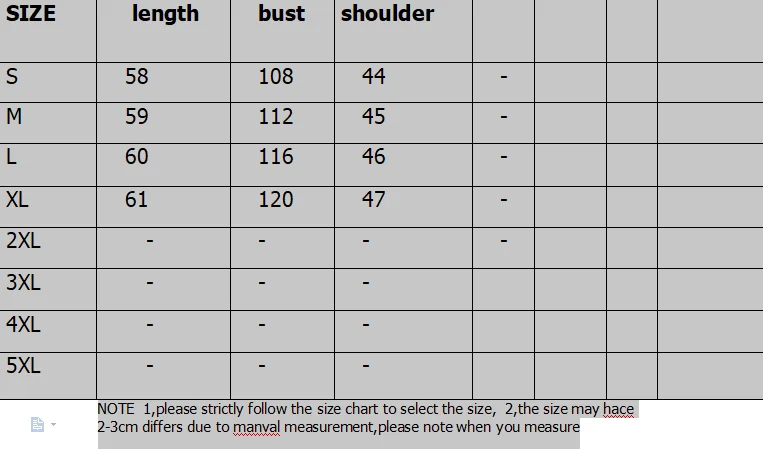 S: Длина 60 см, обхват груди 122 см, плечо 67 см, рукав 40 см, М: длина 61 см, обхват груди 126 см, плечо 68 см, рукав 41 см L: длина 62 см, обхват груди 130 см, плечо 69 см, Рукав 42 см, XL: длина 63 см, обхват груди см, плечо 70 см, рукав 43 см, Примечание: 1 дюйм = 2,54 см, 1 см = 0,39 дюйма Примечание: При измерении вручную допускается погрешность в 2-3 см, это нормально