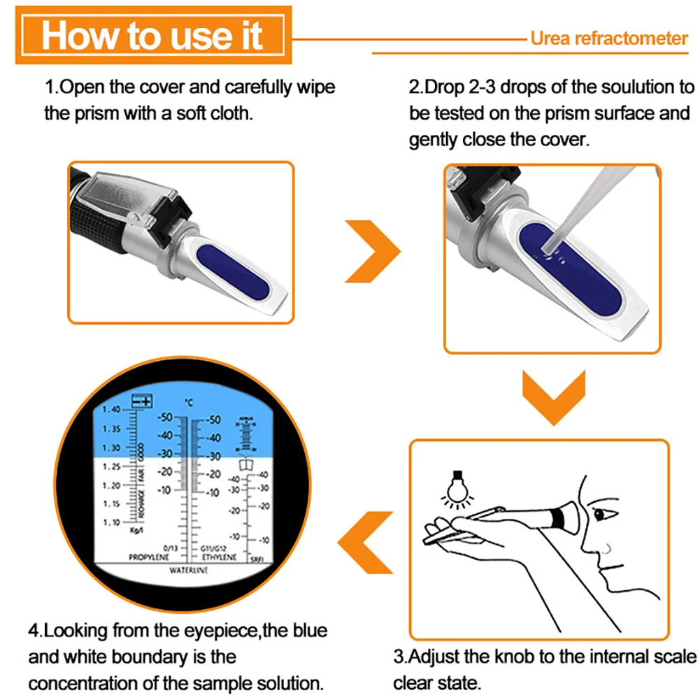 -Этот рефрактометр предназначен для тестирования мочевины, этиленгликоля, пропиленгликоля, аккумуляторных жидкостей и чистящих жидкостей.