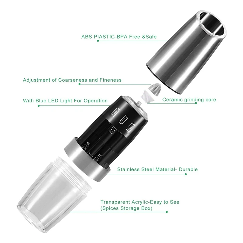 [Отличное качество и Непревзойденная производительность] обеспечивает максимальную прочность и безупречно сочетается с вашим прибором, эта прочная гравитационная шлифовальная машина с батарейным питанием имеет более четкую, коррозионно-стойкую керамическую сердцевину, которая легко и плавно измельчает любые специи, не изменяя свой вкус.