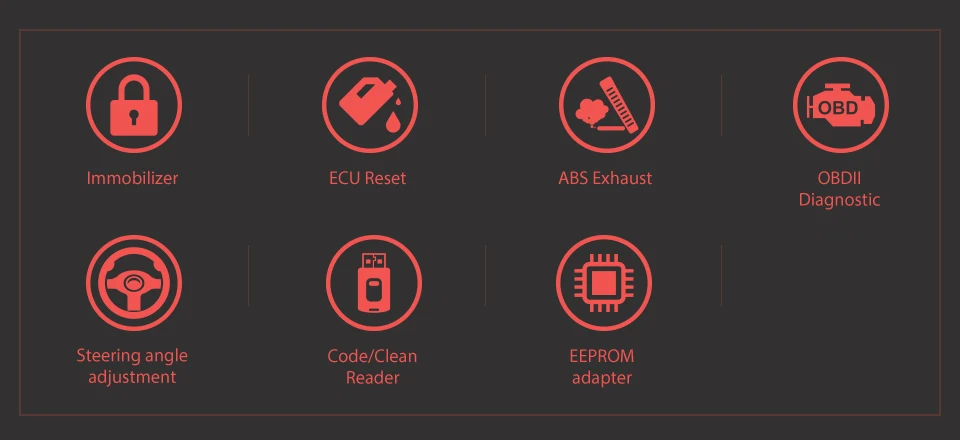 1. Диагностический OBD2: может считывать код ошибки инженерных систем через OBD2 2.EEPROM: работает для некоторых старых моделей автомобилей, не подходит для obd2 может работать с eeprom контактом, также может работать для некоторых чипов 3.ECU Сброс: когда ваш ECU получит любой код ошибки, показывает проблемы, этот x100 pro может сделать сброс для ECU