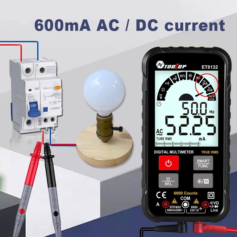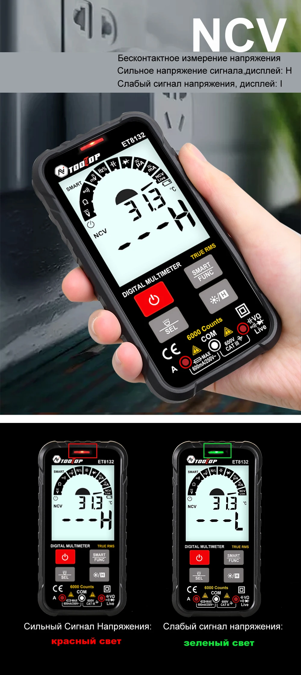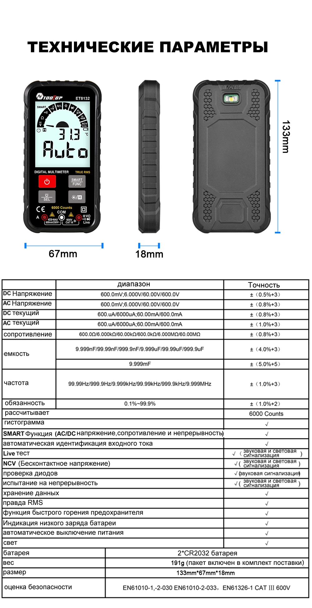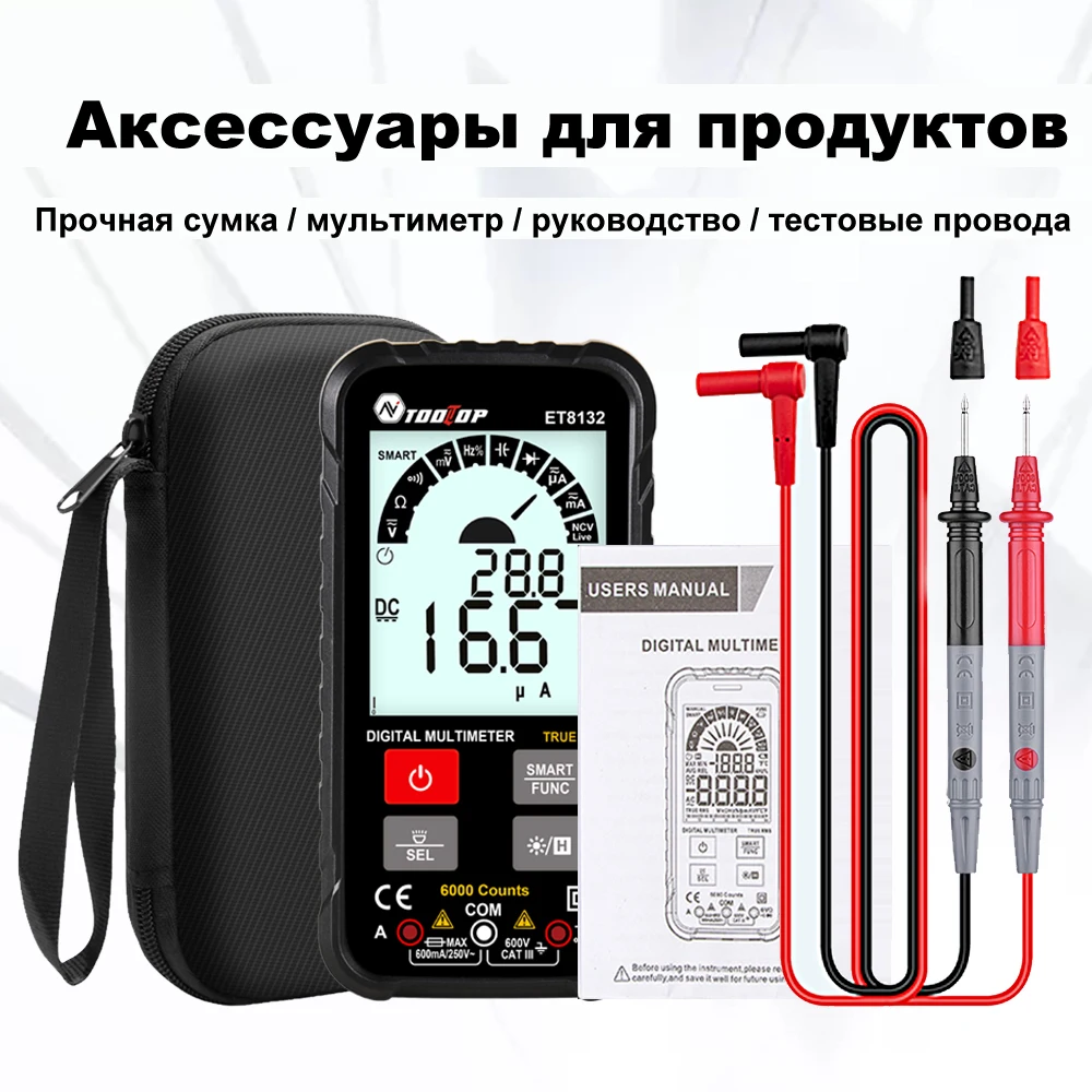 вы можете выбрать ET8132 без батареи или ET8132 с батареей 4 шт! pls дают нам вашу электронную почту,мы пошлем вами русское руководство к вашей электронной почте! Это эффективный карман Размеры True RMS. Интеллигентая (ый) идентификации и манул Функция «2 в 1», который может измерять AC/DC Напряжение, переменный/постоянный ток, сопротивление, постоянной ёмкости, универсальный конденсатор, Continiuty, Diade, бесконтактная проверка напряжения переменного и т. д. Это самый лучший выбор для того, чтобы показать свой профессиональный электрик, инженер, электронных энтузиастов или семейного использования. Особенности: Широкий ассортимент Тесты --- этот цифровой мультиметр может использоваться для измерения напряжения переменного/постоянного тока Напряжение, переменный/постоянный ток, сопротивление, непрерывность, постоянной ёмкости, универсальный конденсатор, Тесты s диоды транзисторов, бесконтактная проверка напряжения переменного живая линия. Смарт измерения --- он может автоматически синхронизируется с постоянного тока, напряжение переменного тока, сопротивление, continiuty без изменения функций. При измерении напряжения переменного тока, частота отображается в одно и то же время. При измерении сопротивлений, в тех случаях, когда сопротивление меньше, чем 50Ω, В звуковой сигнал и индикатор загорится на пульте управления. Высокая точность DISLPAY --- подача заявки на данный мультиметр часть использует специализированный, 6000 Чип, которые могут обеспечить более высокую точность. 2.9in большой ЖК-дисплей дисплей с подсветкой для четкое представление даже под темное время суток. Практичный --- True RMS, бесконтактная проверка напряжения переменного зуммера непрерывности, Подсветка/фонарик в наличии, переменный/постоянный ток 600mA Max, AC/DC напряжение: 600,0 V Max (кат. III) Карманный размер прочная конструкция --- подача заявки на данный мультиметр с компактным размером дизайн и покройте тонким слоем на duraby защиты рукав анти-защита от падения и обеспечивают длительный срок службы. Технические характеристики: Материал: АБС-пластик Цвет: черный Диапазон Управление: автоматически настраивающийся диапазон Отбора проб Скорость: approx.3 раз/сек DC Напряжение диапазон 600 мВ/6В/60В/600V AC Напряжение диапазон 600 мВ/6В/60В/600V Диапазон переменного тока: 6kuA/60ма/600mA Постоянного тока диапазон: 6kuA/60ма/600mA Диапазон сопротивления: 600Ω/6k Ω/60k Ω/600k Ω/6M Ω/60MΩ Постоянной ёмкости, универсальный конденсатор Диапазон: 6nF/60nF/600nF/69 μф/60 μф/600 μф/6mF/60mF Частотный диапазон: 10 Гц ~ 10 МГц Операционной Защита окружающей среды: Температура 0 ℃ до 40 ℃, влажность ≤ 80% RH Для хранения Защита окружающей среды: Температура-10 ℃ до 60 ℃, влажность ≤ 70% RH Основные характеристики: Дисплей отсчет: 6000 ЖК-дисплей Размер экрана: 2.9in Диод: Около 2,0 V Неразрывность: Да Постоянной ёмкости, универсальный конденсатор: Да Частота: Да -Диапазон индикации: показывает "OL" на ЖК-дисплей Авто Мощность ВЫКЛ: Да Непрерывный звуковой сигнал: Да Низкая Батарея индикация: Да Защита от перегрузки: Да Токовой защиты: F600mA/250V Предохранитель Мощность: 2x3V CR2032 (не входит в комплект) Чистый продукт Вес: 134g/4,73 oz Продукт Размеры: 135*67*20 мм/8,15*2,95 * 1.46in В комплект входит: 1 * мультиметр 2 * Тесты свинца 1 * сумка для хранения 1 * Руководство пользователя (на английском языке)