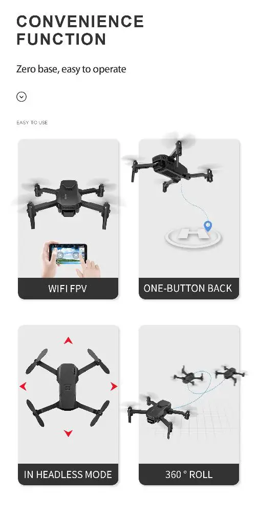 Функции: вверх/вниз, вперед/назад, влево/вправо, боковой полет, светодиодный свет, режим Безголового движения, автоматическое возвращение одной кнопкой, режим удержания высоты, WiFi FPV