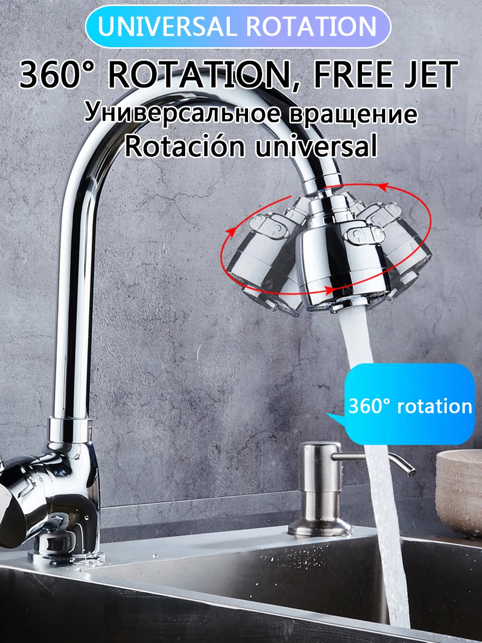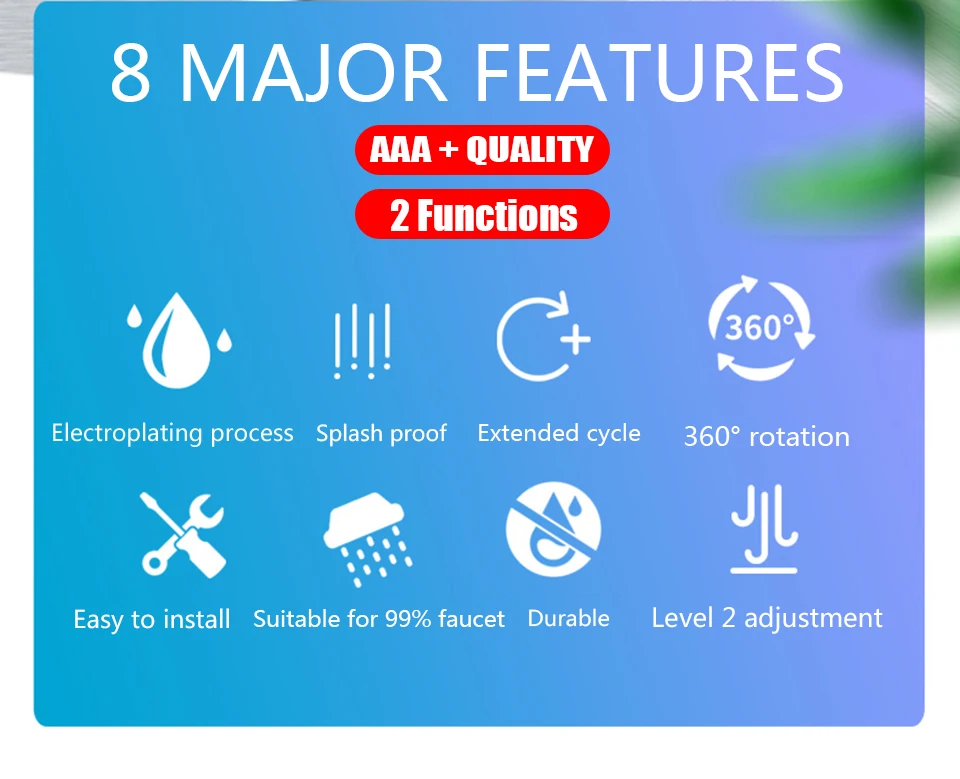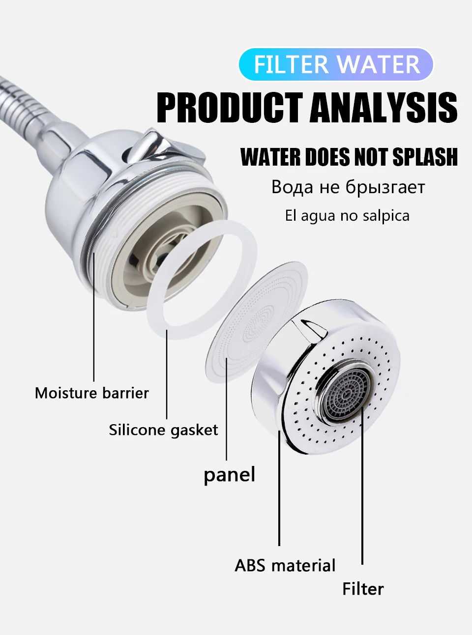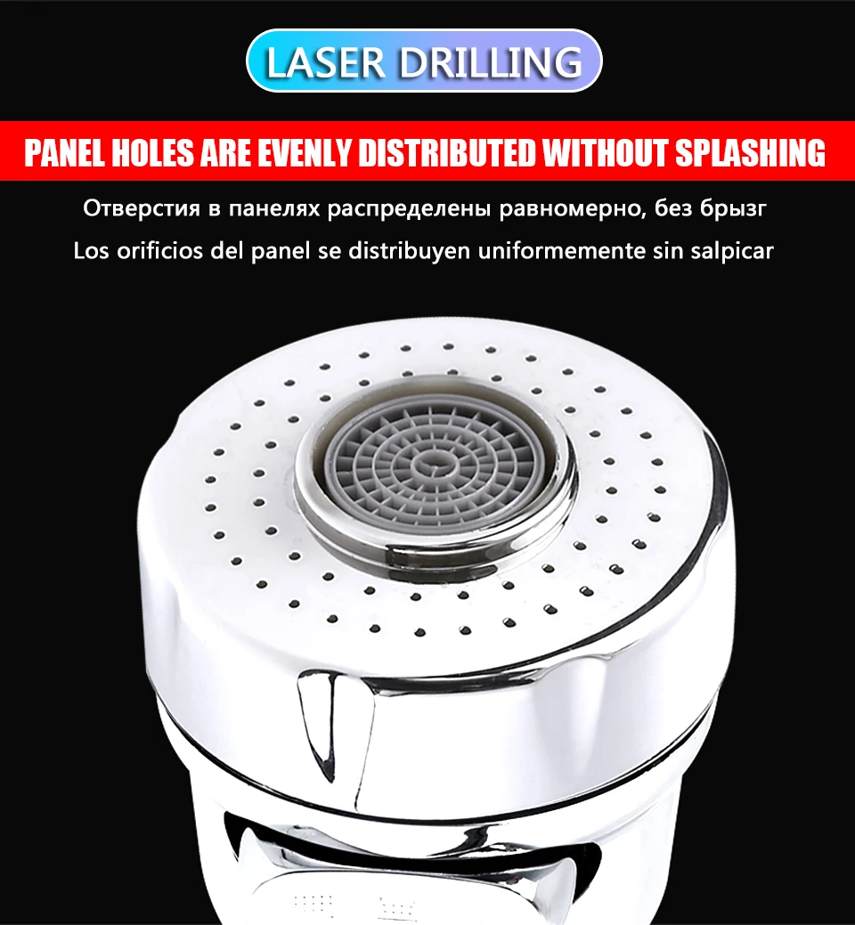 Features: Flexible, anti splashing, multi layer electroplating on the surface, bright as new. High quality stainless steel foaming device, preventing splash of water flower, soft water, anticorrosion and rust prevention. High quality rubber pads at the interface, good sealing, effective prevention of leakage, excellent workmanship and quality. water-saving,,It can save 50% -60% of water source Rotate 360 degrees, rinse every corner Specifications: Size: 75mm*50mm Weight: 64g Surface treatment: chromium plating Caliber: M22*1