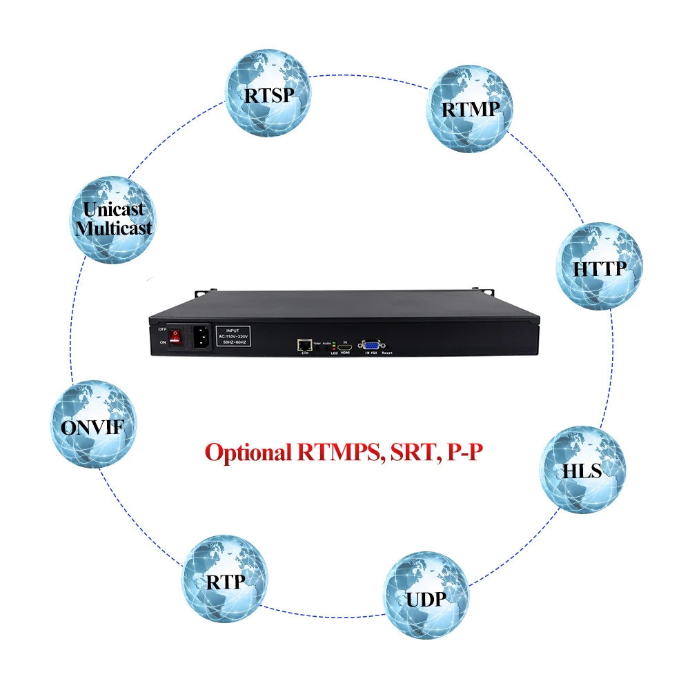 8.Network protocol: Compatible with ONVIF, SRT, HTTP, RTSP, RTMP, RTMPS, UDP Unicast/ multicast, HLS, RTP