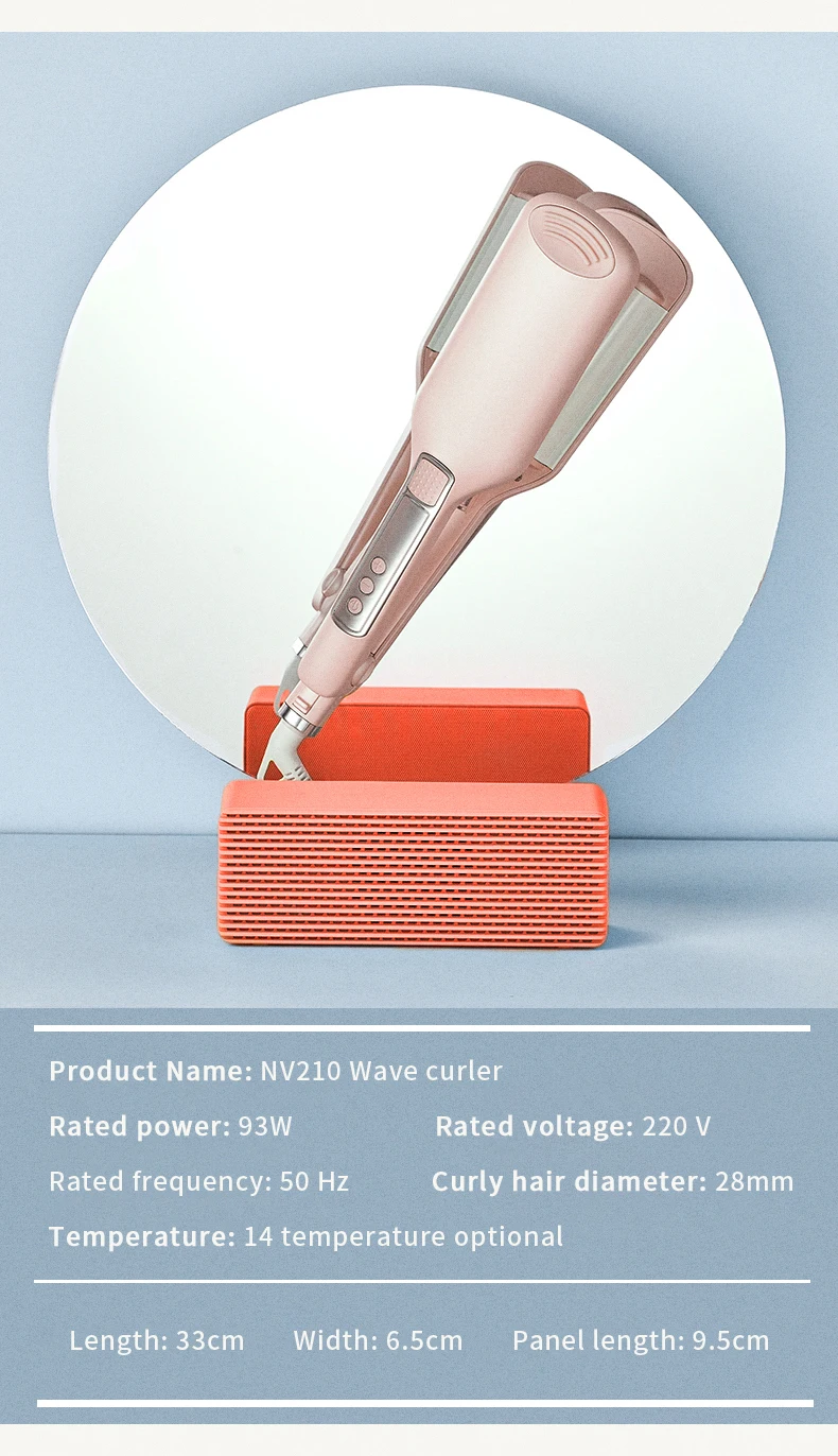 Название продукта: волновые бигуди NV210 Номинальная мощность: 93 Вт Номинальное напряжение: 220 В Номинальная частота: 50 Гц Диаметр кудрявых волос: 28 мм Температура: 14 температура на выбор Длина: 33 см Ширина: 6,5 см Длина панели: 9,5 см