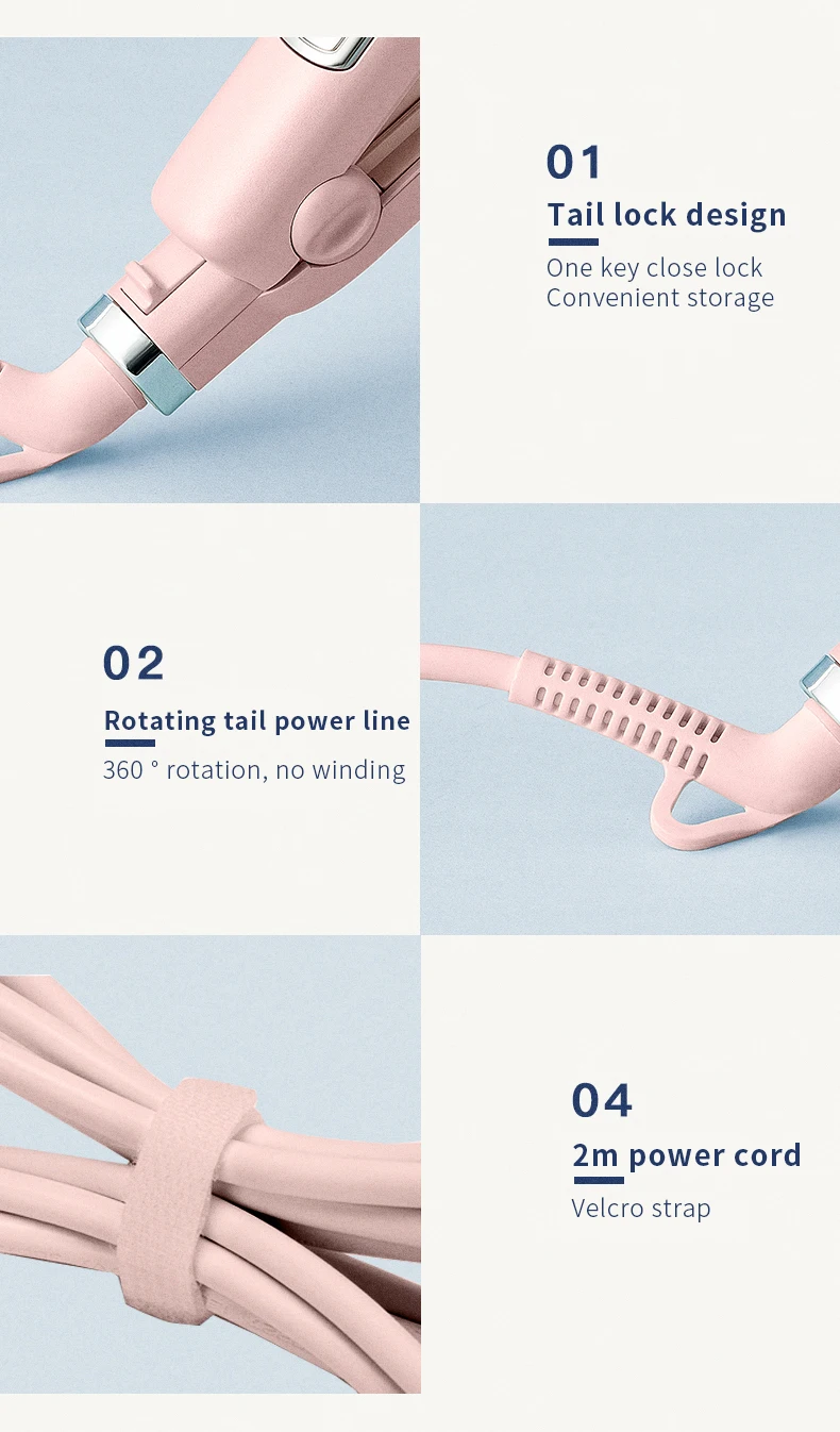 01 Конструкция хвостового замка Закрыть замок одной кнопкой Удобное хранение 02 Линия электропередачи вращающийся хвост Вращение на 360 °, без намотки 03 Шнур питания 2 м Ремень на липучке