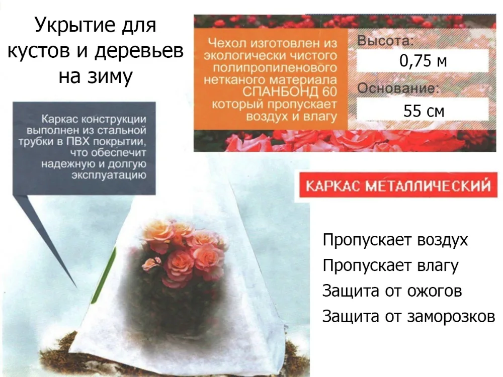 Материал конуса - спанбонд 60, изготовленный из первичных полиэфирных волокон высокой очистки. Металлически опоры покрыты пластиковым напылением, препятствующим коррозии. Благодаря использованию высококачественного сырья, такое зимнее укрытие прослужит ни один год.