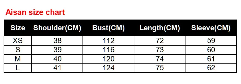 1: Все Размеры приведены для вашей справки, учитывайте погрешность в 1-3 см, 1 см равен 0,39 дюйма. 2: Это Азиатский Размер, он меньше на 2-3 размера, чем Европейский/американский. Поэтому очень важно сравнить размер плеч и груди. 3: поскольку разные компьютеры отображают цвета по-разному, цвет самого элемента может незначительно отличаться от цвета на изображениях выше, спасибо за понимание.