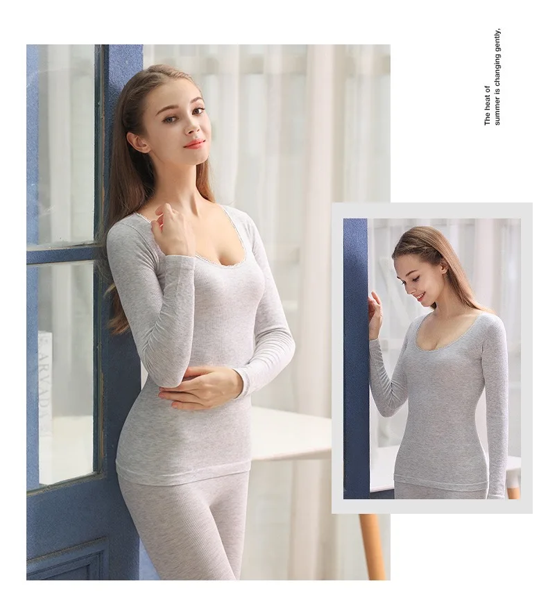 Сексуальные кружевные пижамы, термобелье, набор, Дамское однотонное хлопковое теплое Белье для сна, длинный рукав, штаны, костюм для женщин, 2 шт пижамы