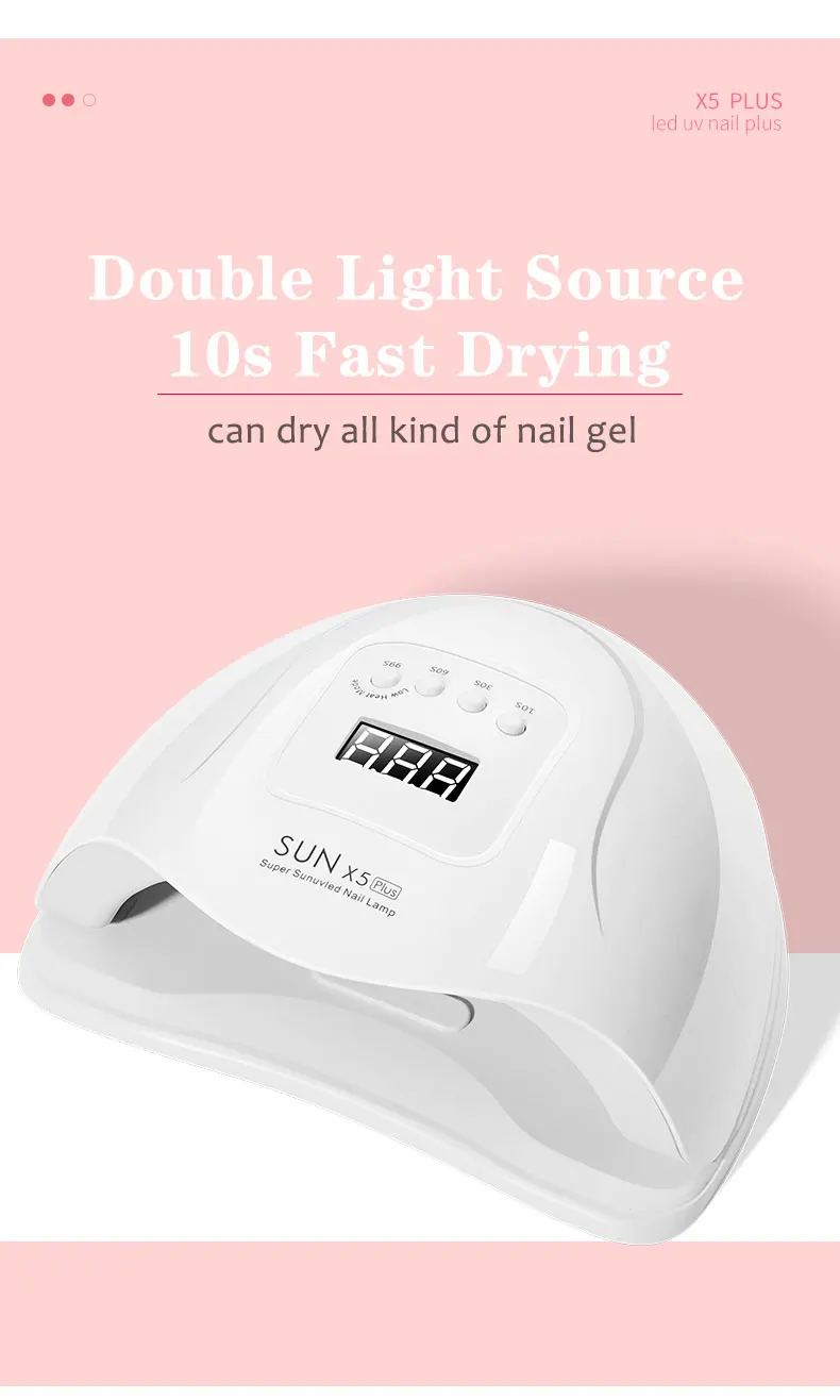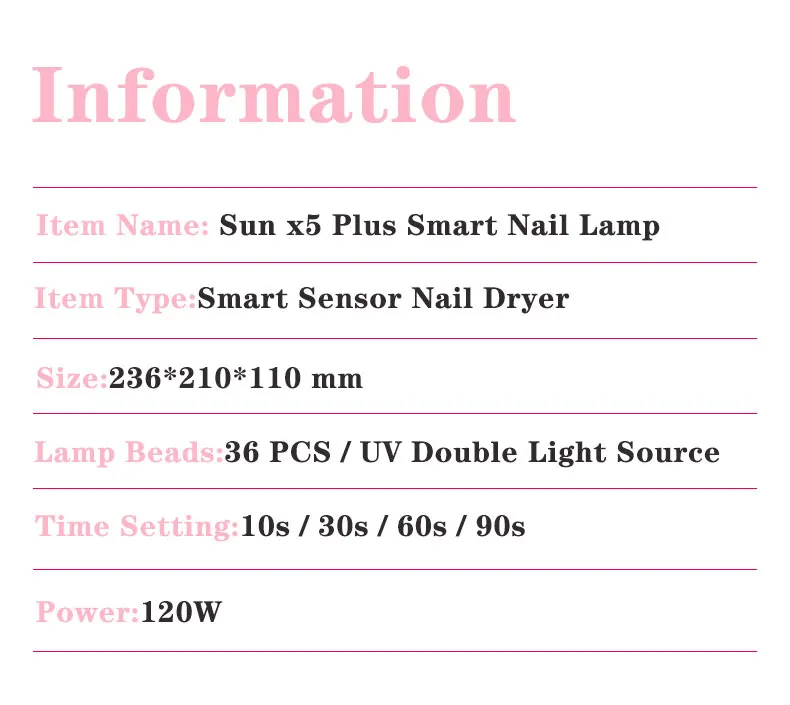 Спецификация: Тип изделия: SUN X5 Plus УФ светодиодная лампа для ногтей Материал: АБС-пластик Мощность: 120 Вт мощная светодиодная лампа для ногтей Вход: 100-220 В сушильная лампа для ногтей Размер: 236*210*110 мм Функция: Сушилка для ногтей лампа для маникюра