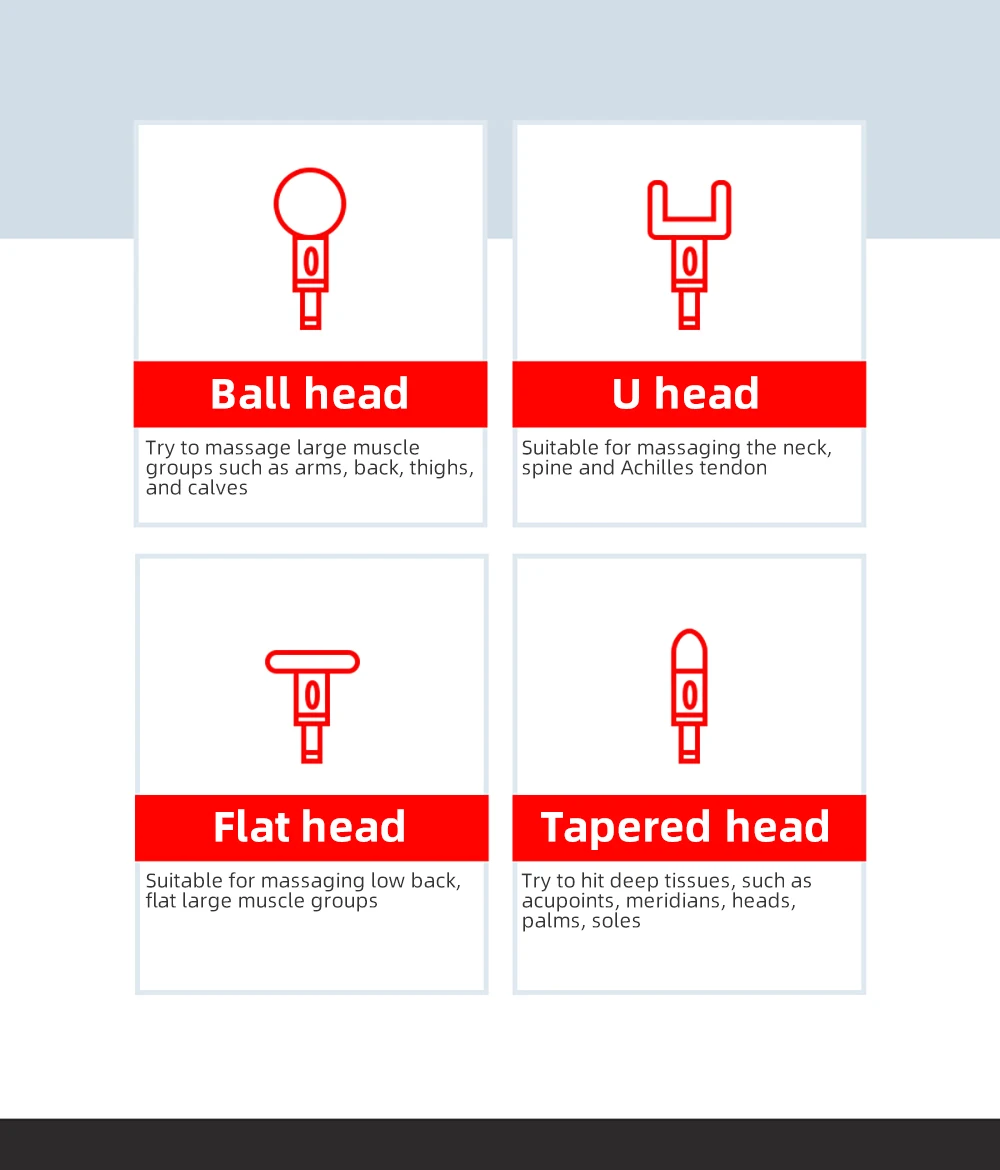● 4 типа сменных массажных головок: массаж шеи, плеч, спины, груди, талии, подошвы, икры, бедер и т. д. и расслабление мышц через удобную стимуляцию. ● 6 уровней регулировки интенсивности: для удовлетворения различных потребностей интенсивности различных людей. 2000 об/мин, пробуждение мышц; 2200 об/мин, реабилитационное обучение; 2400 об/мин, релаксация фасции; 2600 об/мин, разложение молочной кислоты; 2800 об/мин, глубокий массаж; 3000 об/мин, профессиональный массаж ● 5 часов длительной работы батареи: 2000 мА · ч долговечная литиевая батарея, зарядка в течение 3 часов, в режиме среднего диапазона, срок службы батареи до 5 часов. Используйте в течение 10 минут каждый раз в день, что может длиться 1 месяц; ● Бесшумная технология шумоподавления: использование 26 мощных бесщеточных моторов с двухподшипниковой передачей обеспечивает высокую мощность и значительно снижает уровень шума. Шум менее 45 дБ. ● Оборудование для массажа fascia gun может быть применено ко всем видам людей, включая людей фитнеса, офисных работников, родителей и пожилых людей. Для этих людей это хороший подарок. ● Сенсорный ЖК-экран высокой четкости, рабочий дисплей более лаконичный;