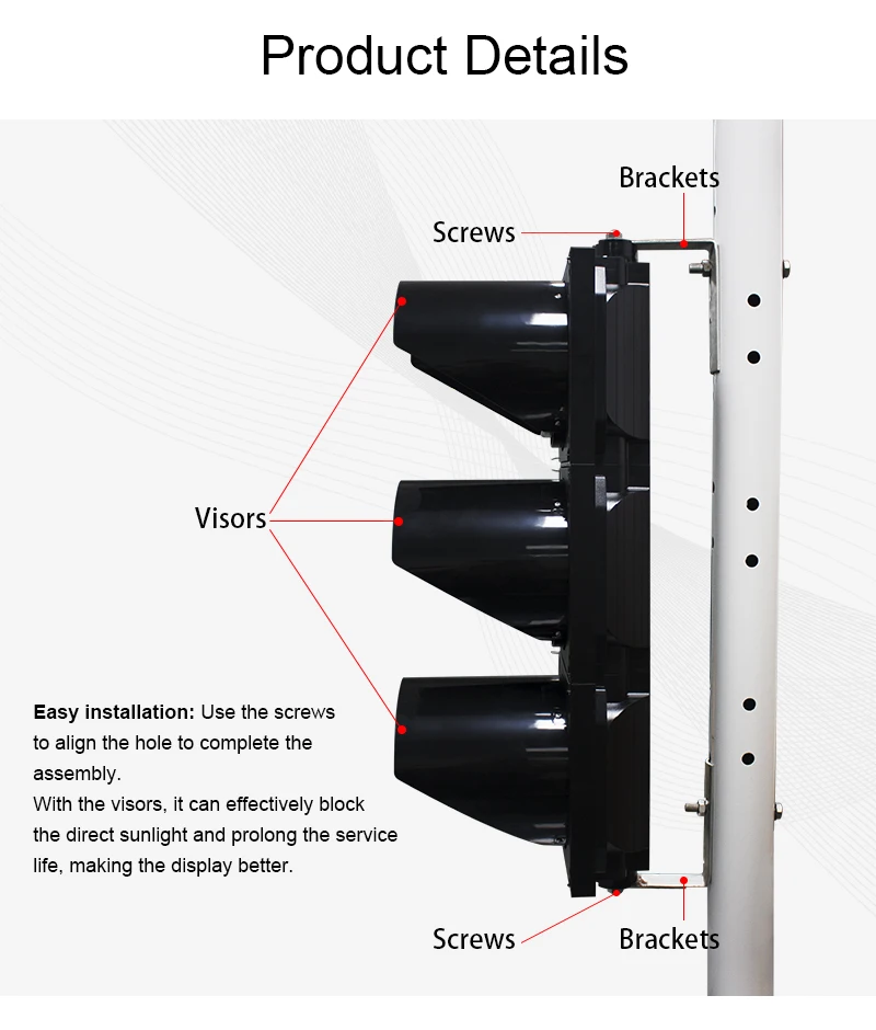 1. Светодиодный: наш светодиодный светильник указан в списке UL, каждый светодиодный светильник импортируется из Тайваня. Светодиодный срок службы до 100000 часов. Светодиодный красный с яркостью 4000-5000mcd, желтый светодиодный с яркостью 4000-5000mcd, зеленый светодиодный с яркостью 7000-9500mcd. Светодиодный светильник-Светодиод представляет собой светильник источник, со стабильной производительностью и идеальный дисплей эффект. 2. Черный корпус и водонепроницаемость: прочный черный корпус для обеспечения долговечности и многослойное уплотнение защищает объектив от пыли и воды, чтобы защитить его от воды в суровых погодных условиях. Класс водонепроницаемости IP65. 3. Прозрачные линзы и модули: сделаны из прозрачных линз, высокой проницаемости, огнестойкости, анти-УФ. Диаметр модулей около 188 мм (8 дюймов). 4. Рабочее напряжение и простая установка: Рабочее напряжение DC9-36V или 85V-265VAC; Установка может быть горизонтальной или вертикальной. Красный светильник к R терминалу, желтый светильник к Y терминалу, зеленый светильник к G терминалу, общая линия. 5. Сертификат и гарантия: он получает сертификаты FCC, CE, IP65, RoHS. Два года гарантии.