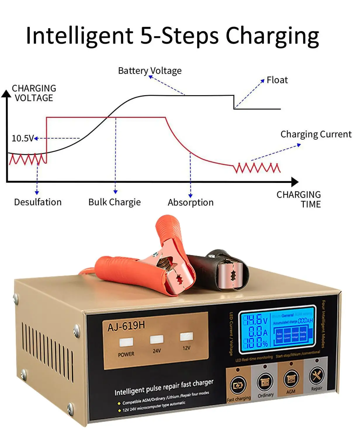 Идеально подходит для зарядки всех 12 В 24 В свинцово-кислотных, сухих батарей, водяных батарей, свинцово-кислотных батарей без обслуживания AGM стартовый аккумулятор и зарядное устройство безопасности