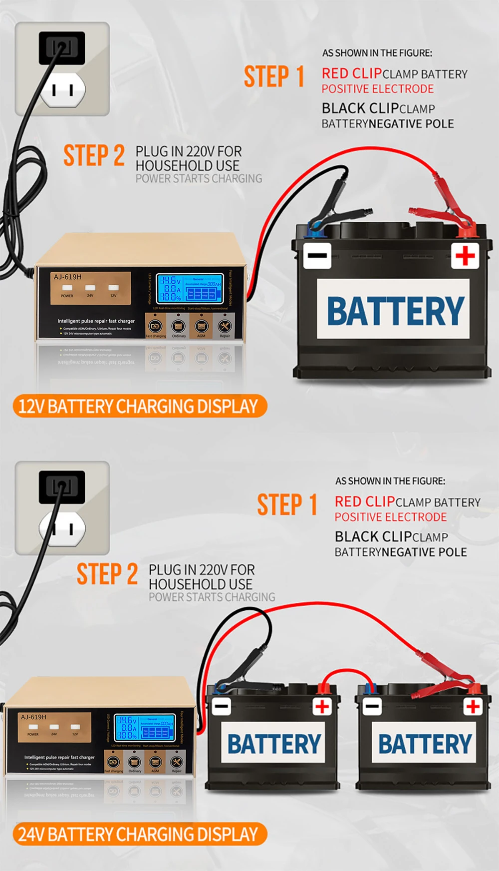 Данное зарядное устройство специально разработано и изготовлено для свинцово-кислотных, сухих батарей 12 В/24 В, водяных батарей, свинцово-кислотных батарей, AGM стартовый аккумулятор (Емкость батареи: 6-400Ah)