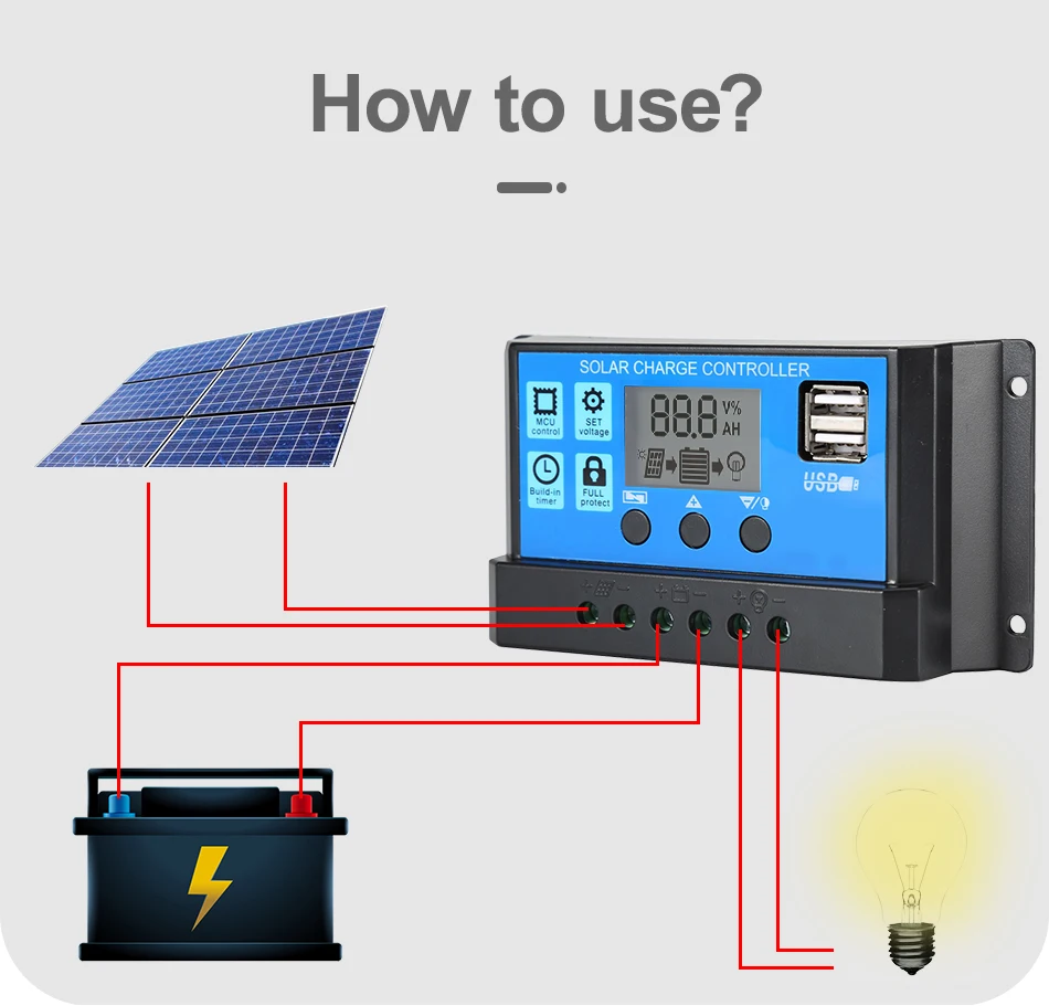 3. Подключите потребителя к регулятору заряда-плюс и минус.Обратный заказ применяется при деустановке!