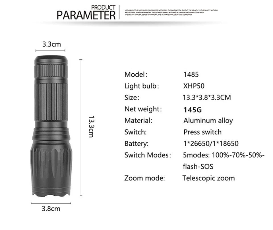 • Бренд:Litwod • Название модели:1485-P5• Количество:1 шт. • Светодиодный излучатель:XHP50• Режим:5 режимов (высокий-средний-низкий-SOS-Стробоскоп) • Срок службы:100 000 часов • Цвет:Черный • Излучаемый Цвет:Белый свет • Линзы:Выпуклая линза • Материал корпуса:Прочный авиационный алюминий • Аккумулятор:1 x аккумулятор 18650 / 26650 (не входит в комплект) Зарядное устройство: • Вход:AC110-220V 47-63 Гц • Выход:3,7 В; Примечание:1.Виды спецификации зарядного устройства, мы выберем правильное зарядное устройство в соответствии с вашей страной. Потому что это ручной выбор, неизбежно, что будет неправильное решение. Я надеюсь, вы можете сообщить нам, какая Спецификация зарядного устройства вам нужна в сообщении о заказе. Спасибо вам. 2.Более 95% покупателей пожалеют, что не покупают упаковку с аккумулятором и зарядным устройством, потому что в их стране батарея и зарядное устройство очень дорогие, и в Китае, аккумулятор и зарядное устройство не только превосходны по качеству, но и очень дешево. Поэтому рекомендуется приобрести упаковку с аккумулятором и зарядным устройством.