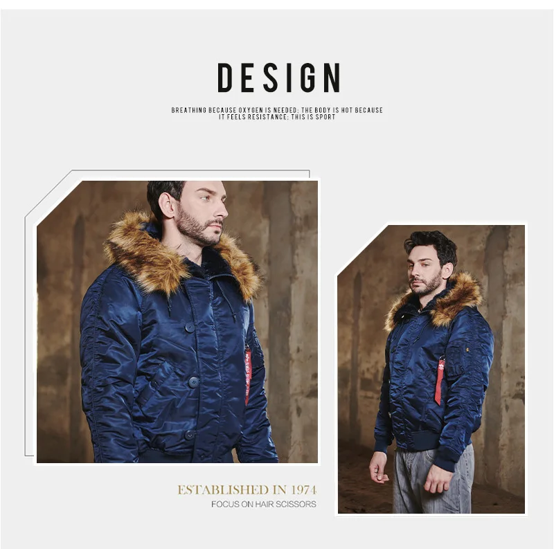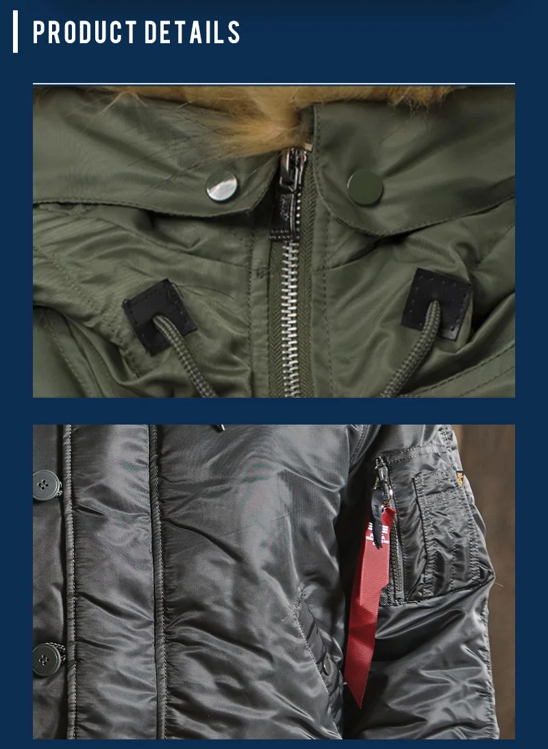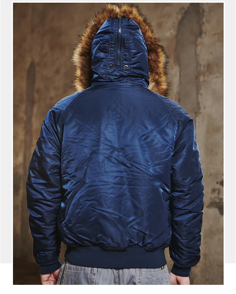 Укороченная парка N-2B с ее 100% водоотталкивающей нейлоновой оболочкой и подкладкой из полиэстера предназначена для выдерживания отрицательных температур. Уникальный «сквозной» передний карман был создан для того, чтобы пилоты могли залезть в карманы штанов, не подвергая руки воздействию низких температур. Для дополнительной защиты капюшон на подкладке и оторочен синтетическим мехом мутона. Парка N-2B только для химчистки с капюшоном на молнии и трикотажными манжетами / поясом.